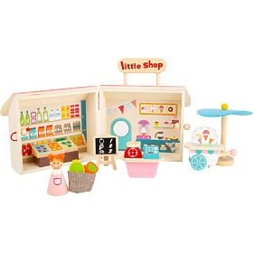 Pojďme nakupovat! Tento kompaktní obchůdek v dřevěném kufříku má šikovný zámek a najdete v něm zmrzlinový stánek, slunečník, několik kusů ovoce a zeleniny, .. více