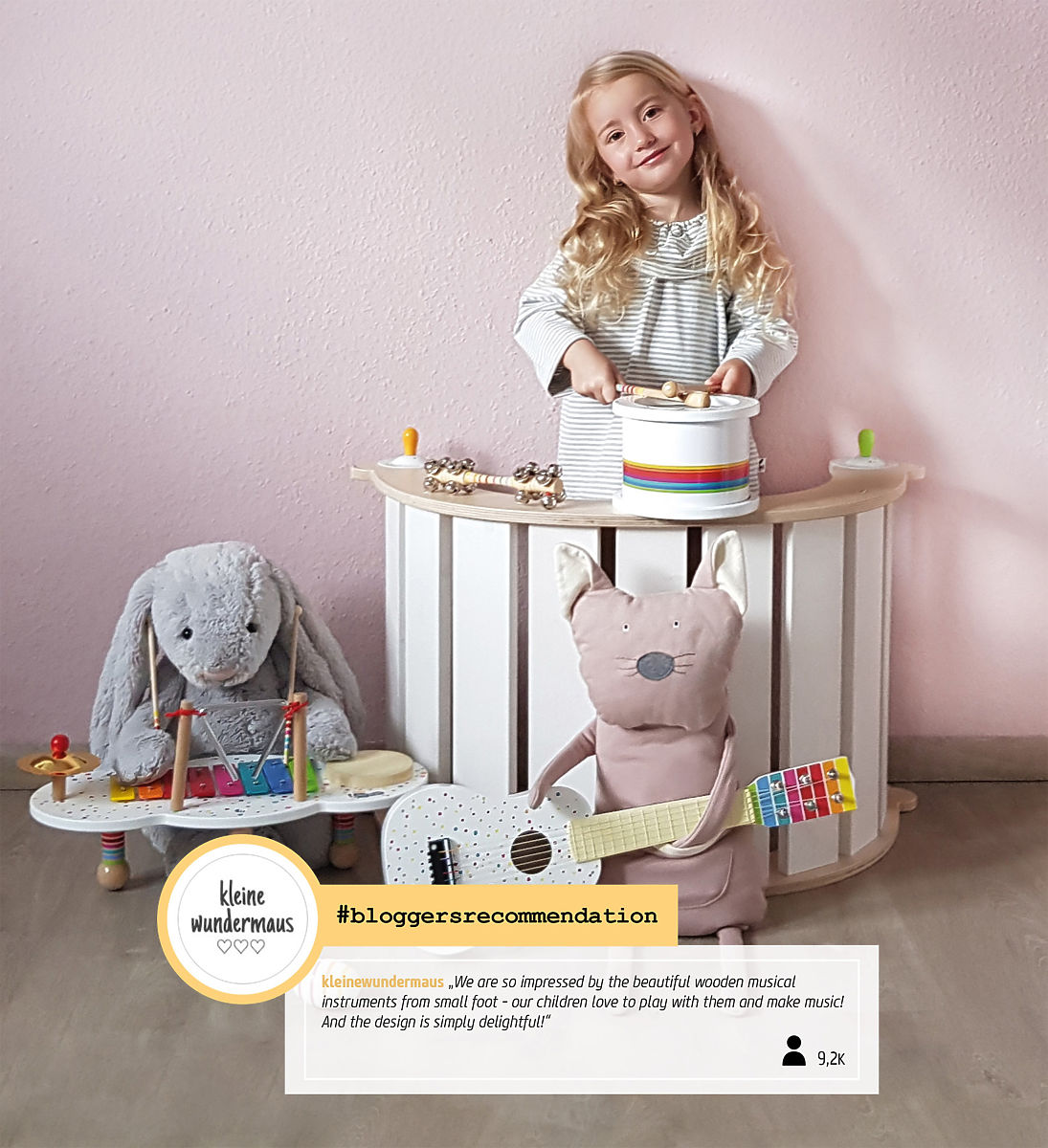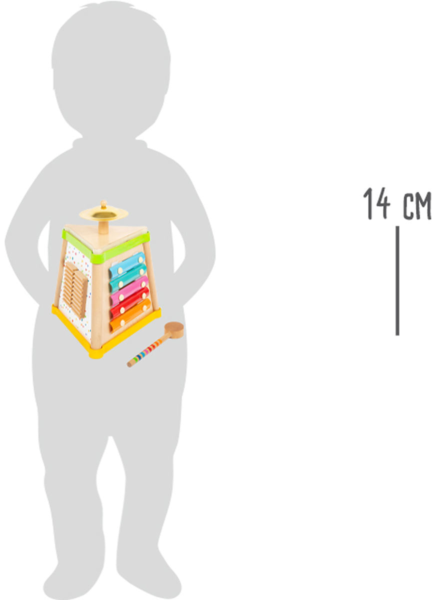 Hudba a tóny Vás zaručeně rozveselí! Tento pestrobarevný dřevěný komolý jehlan nabídne na svých třech stranách různé možnosti tvoření rytmických zvuků. Je zde chrastítko, mini xylofon a bubínek. Malý činel na vrcholku se rozezvučí zvonivým zvukem. Všestranná zvuková sada dává hudební show zelenou! Nejedná se o hudební nástroj, ale o hračku. Hlavní vlastnosti: 4 zvukové nástroje a paličkatrénuje sluch, jemnou motoriku a smysl pro rytmus