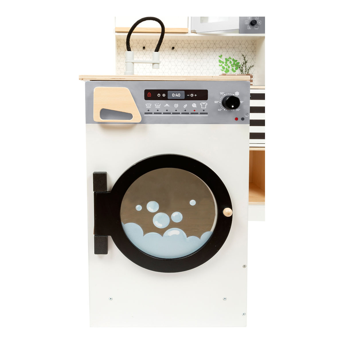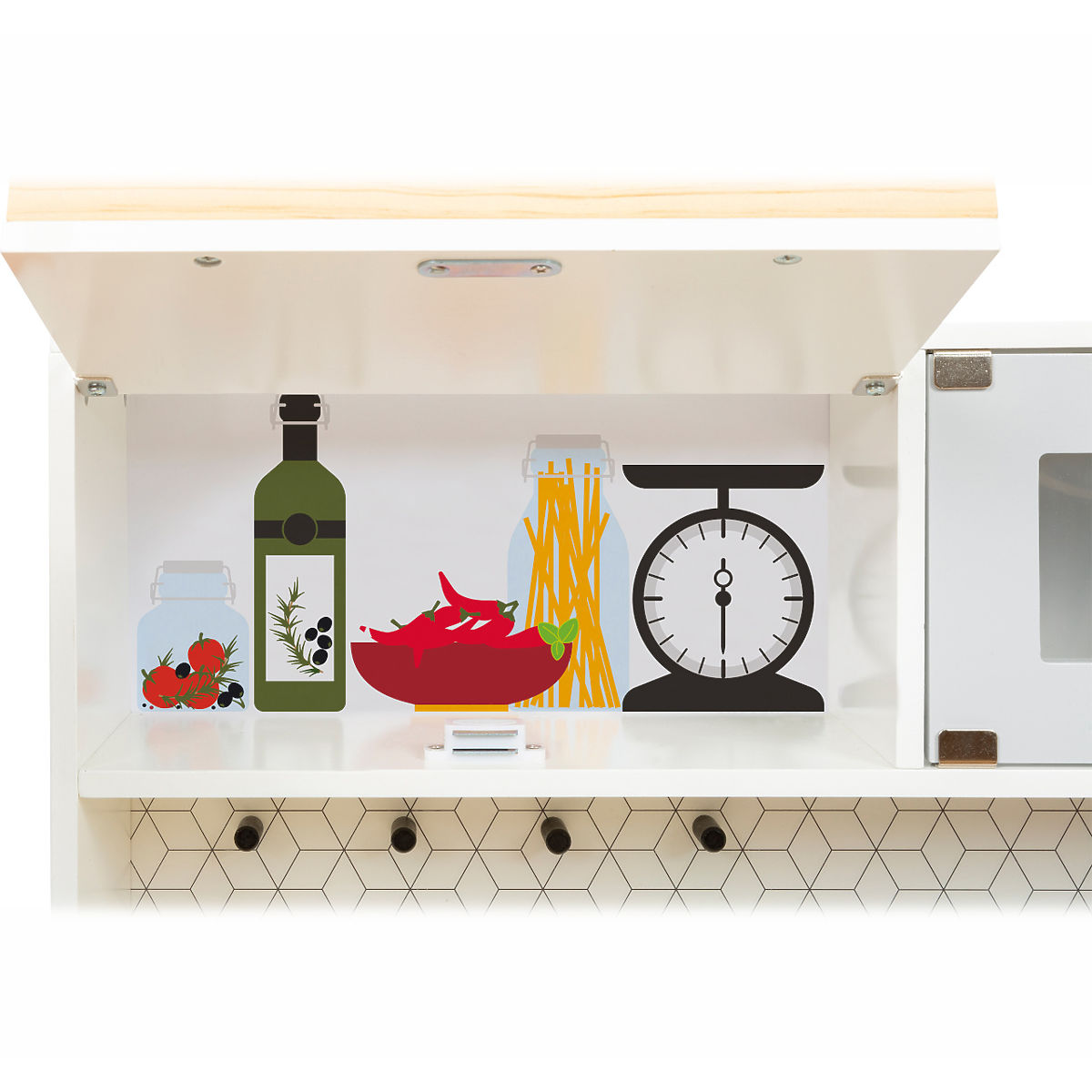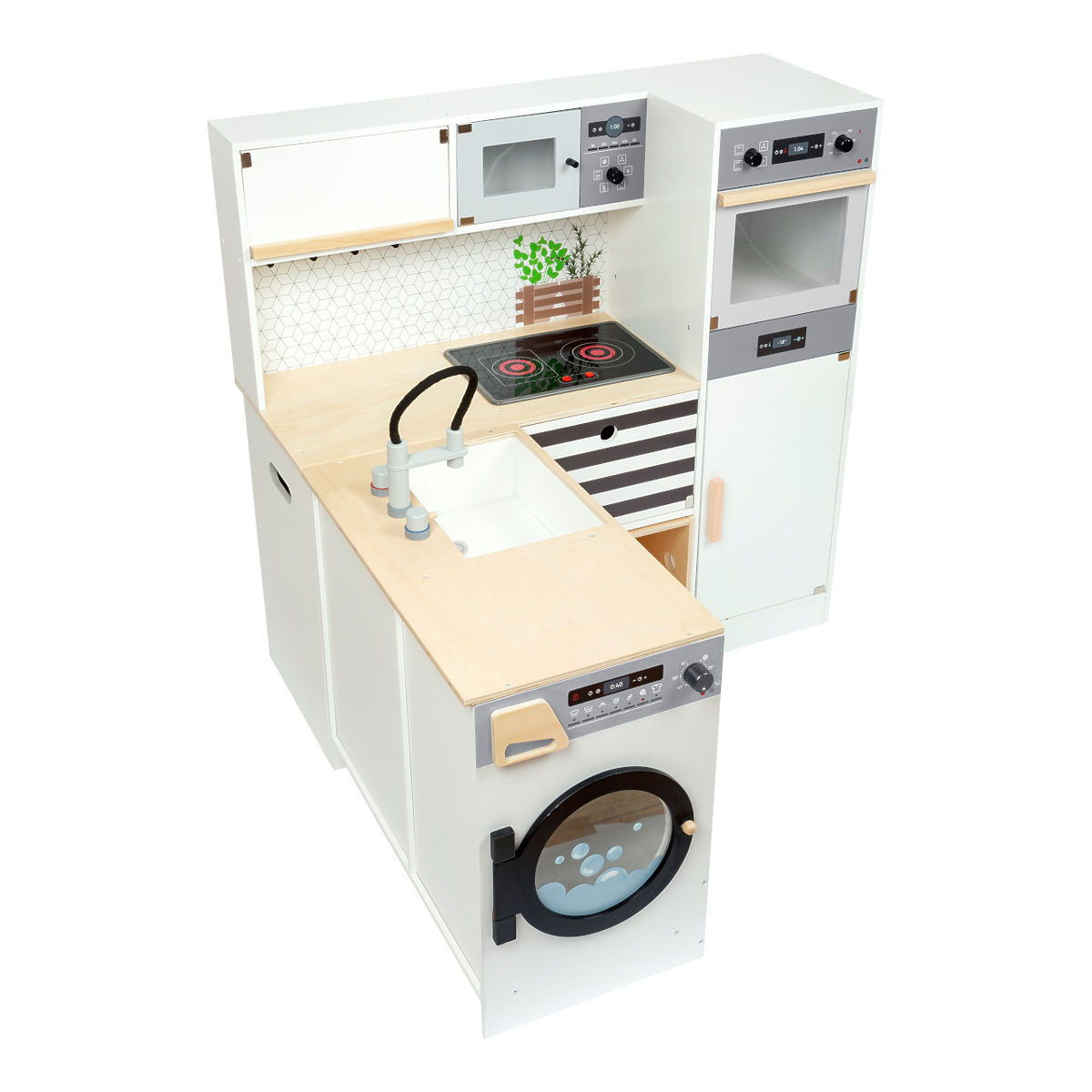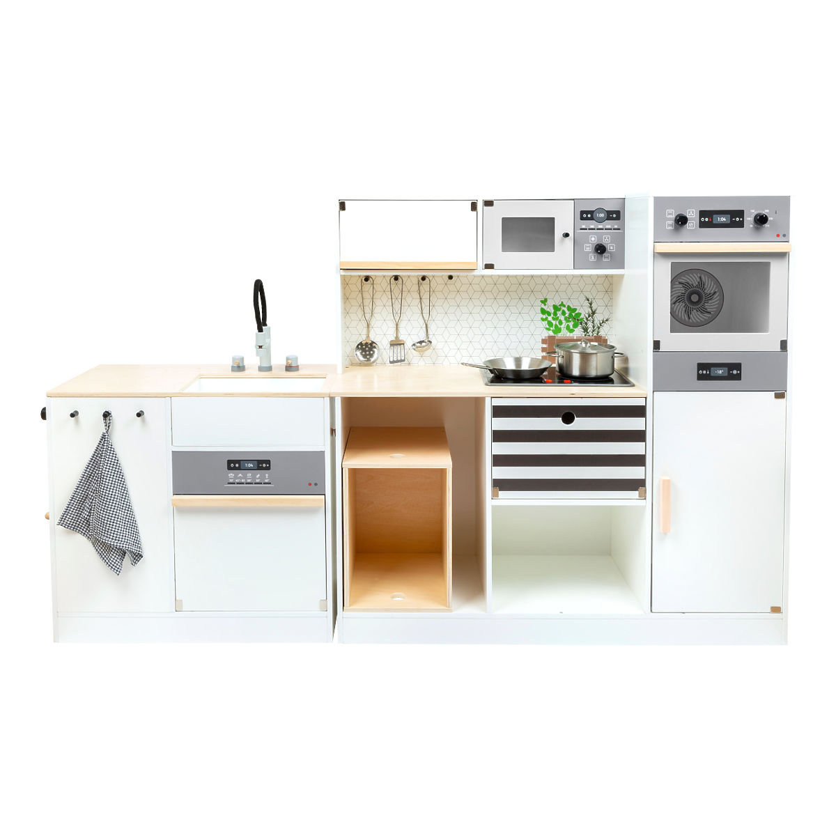 Pro všechny kuchaře a hospodyně! Tato velká, plně vybavená dětská kuchyňka nabízí všechny spotřebiče moderní domácnosti. Díky svému stavebnicovému systému lze sestavit jako rohovou kuchyň, nebo kuchyňskou linku s fungujícím ostrůvkem, nabízí tak mnoho prostoru a možností i pro hru více dětí najednou. Otočné knoflíky cvakají a varná deska s bateriově napájeným (baterie nejsou součástí balení) světlem a zvukem zaručují realistické potěšení ze hry. Skříňky zajišťují dostatek úložného prostoru a jsou vybaveny dvířky. Součástí je vysoce kvalitní nádobí vyrobené z kovu. Pro kuchyňku se nabízí také velké množství doplňkového příslušenství. Výrobek vyžaduje montáž, dodáváno s obrázkovým návodem k sestavení. Hlavní vlastnosti:dětská kuchyňka: sporák, trouba, mikrovlnná trouba, lednice, úložné prostorykuchyňský ostrůvek: dřez, pračka, myčka nádobípříslušenství: hrnec, pánev, otočný talíř, lžíce, naběračka, utěrkasvětelné a zvukové efekty (baterie nejsou součástí balení)multifunkční, různorodé využitírobustní a odolné provedení