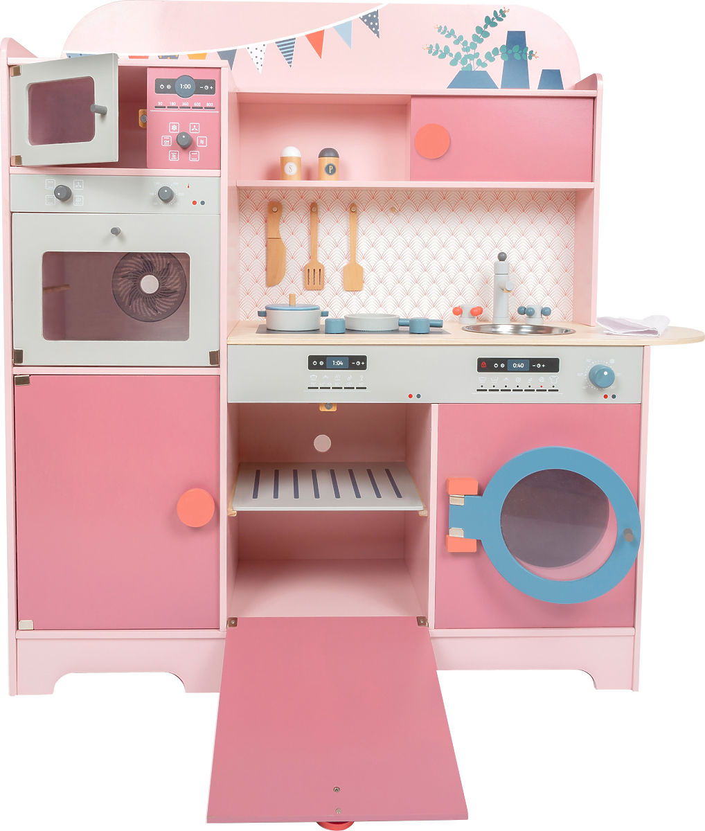 S touto kuchyňkou je michelinská hvězda Vaše! Tato dětská dřevěná kuchyně v moderním růžovém retro vzhledu se sporákem, dřezem, pračkou, myčkou nádobí, lednicí, mikrovlnnou a horkovzdušnou troubou je jako dělaná pro dlouhé hodiny zábavy. Knoflíky cvakají a dvířka spotřebičů jsou otevírací. Dodáváno včetně servírovacího příboru, hrnce, pánve, solničky a pepřenky. Hlavní vlastnosti: množství spotřebičůdvířka s magnetickým zavíráním a cvakající ciferníkyrealisticky ilustrované ovládací panely spotřebičů součástí malá sada příslušenství k vařeníúložný prostorpodporuje aktivní hraní rolí a sociální dovednosti