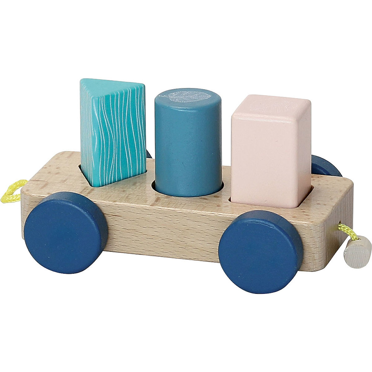Dřevěná multifunkční hračka, vláček, na který můžete skládat kostky. Kostky mají různé velikosti, tvary a barvy. Mašinka a vagónky jsou spojeny textilními poutky s dřevěnou kuličkou. Vláček je pojízdný. Vhodné od 18 měsíců. Hlavní vlastnosti: multifunkční hračkaobsahuje 22 dílů