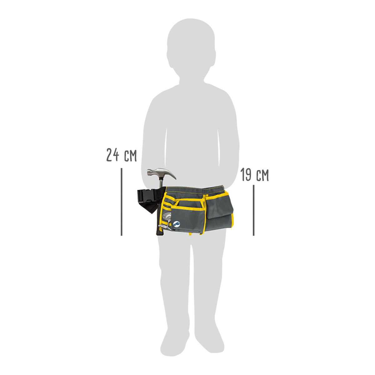 S tímto robustním opaskem na nářadí budou mít děti své nástroje vždy po ruce. Ať už je to tesařské kladivo, plochý nebo křížový Phillips šroubovák, kovový tesařský úhelník, ochranné brýle, pracovní PU rukavice, pérové svěrky a hřebíky, tužka a strouhátko nebo měřící páska. Tento obsáhlý set musí mít každý mladý kutil nebo kutilka. Nastavitelný opasek se zapínáním na přezku má 8 přihrádek, poutko na kladivo, také karabinu. Vodováha má na straně magnetický pásek, je univerzální – dokáže měřit vodorovně, svisle i ve 45°. Kladivo má gumové madlo, aby nevyklouzlo dětem z ruky. Šroubování, zabíjení kladivem, měření, náčrty, to vše trénuje zručnost dětí. Realistické nářadí pro děti bude perfektní pomůckou pro jejich první projekt. Opasek je ideální pro větší děti. Hlavní vlastnosti Nastavitelný opasekZapínání na přezkuDětské ale realistické nářadí