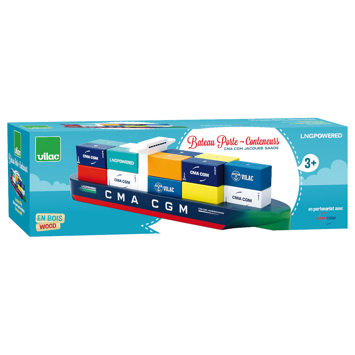 Barevná dřevěná nákladní loď s magnetickými kontejnery je replikou lodi Jacques Saadé, první lodě využívající k pohonu kapalný zemní plyn (LNG). Hračka byla vyrobena ve spolupráci s čelní francouzskou přepravní společnosti CMA CGM. Je součástí Vilacity kolekce a je se všemi jejími součástmi plně kompatibilní, další samostatná rozšíření přinesou variabilitu a prohloubí zážitek ze hry. Hlavní vlastnosti:loď a 18 kontejnerůmagnetická spojeníkompatibilní se všemi součástmi Vilac Vilacity kolekcevyrobeno ekologicky, šetrně k prostředí V2357 – Přístavní jeřáb Vilacity (není součástí sady, najdete v naší nabídce): V2358 – Nákladní auto Vilacity (není součástí sady, najdete v naší nabídce): Příklad sestavy lodě s dalšími součástmi kolekce Vilacity: