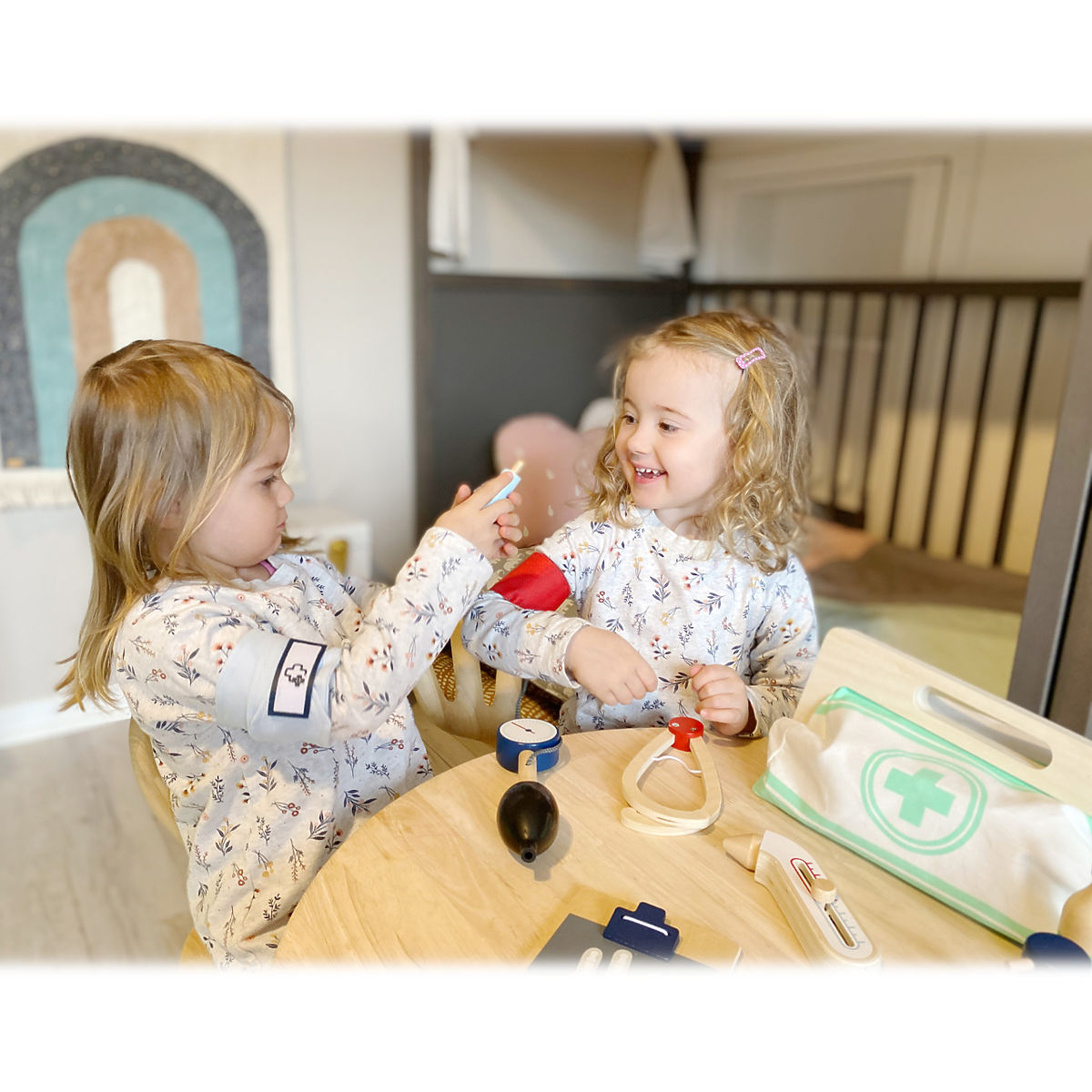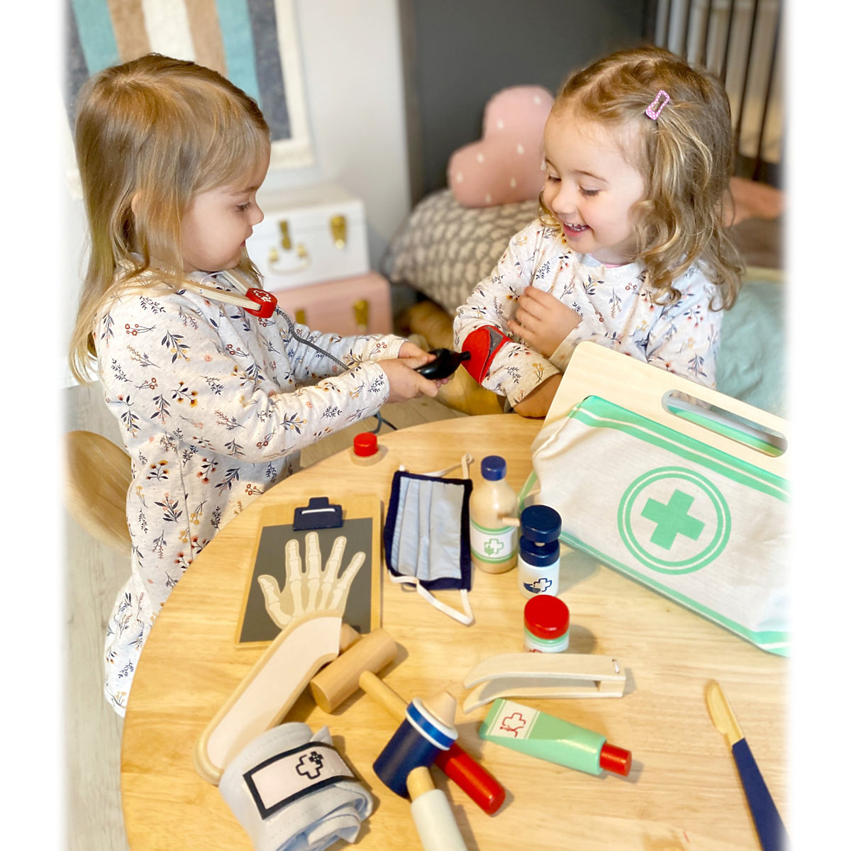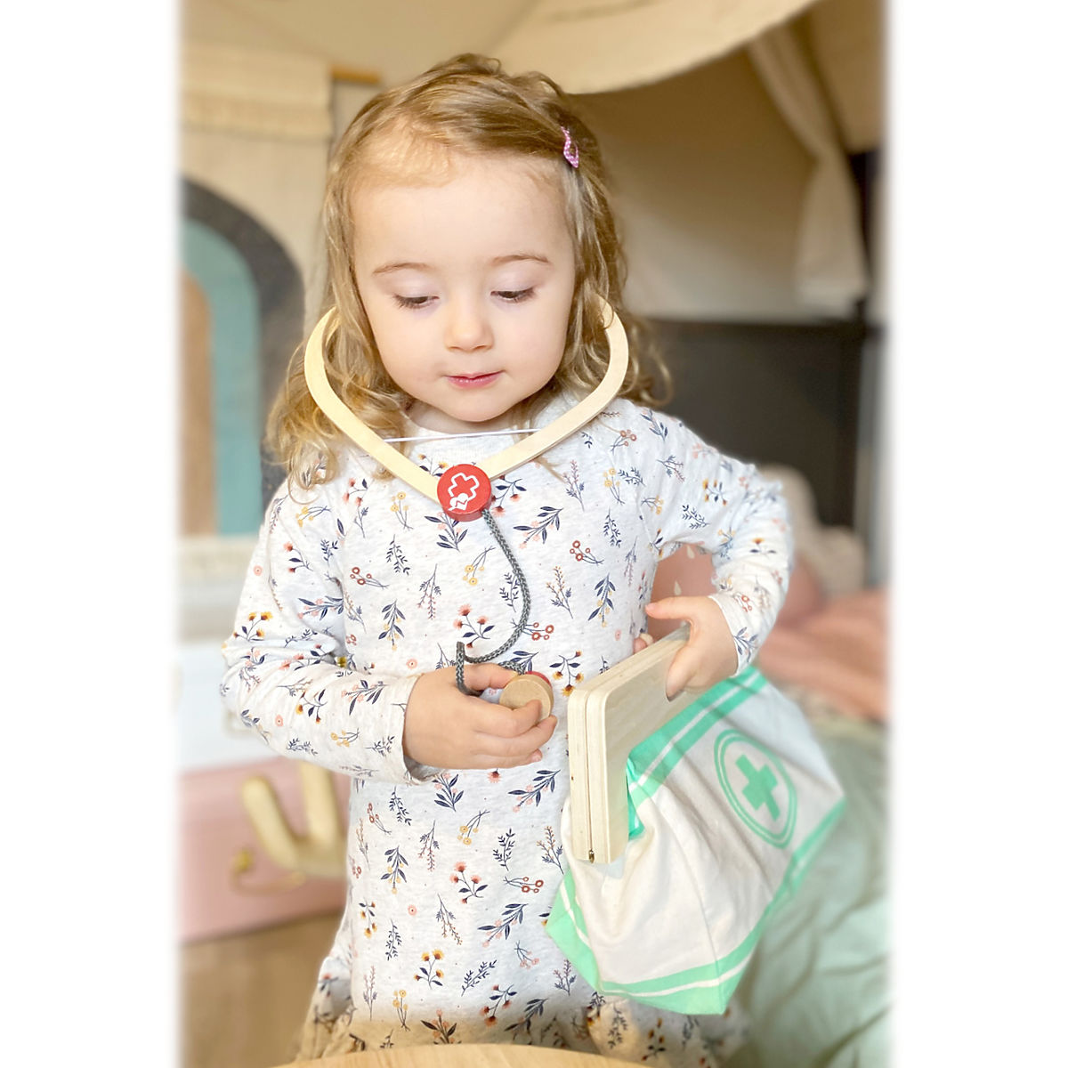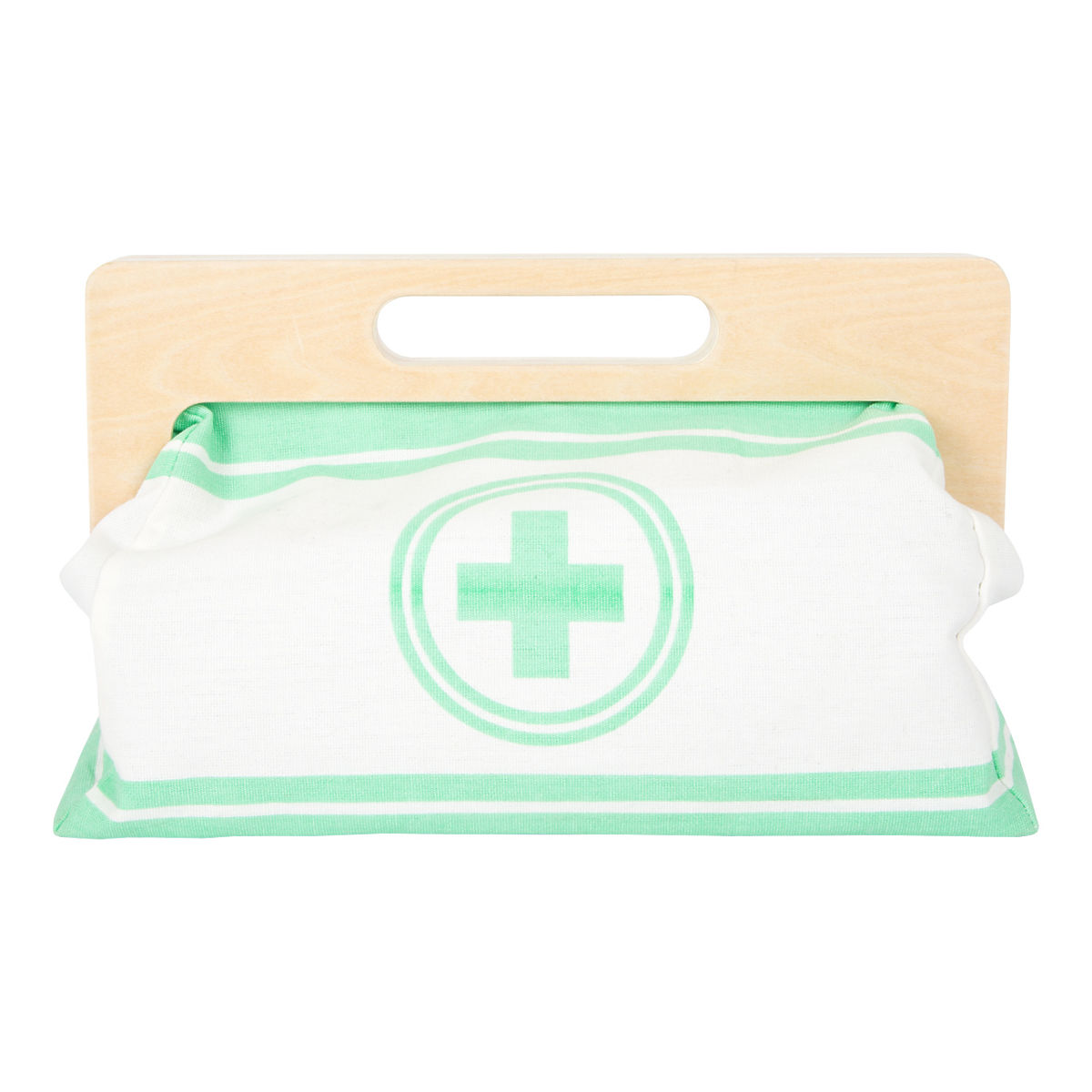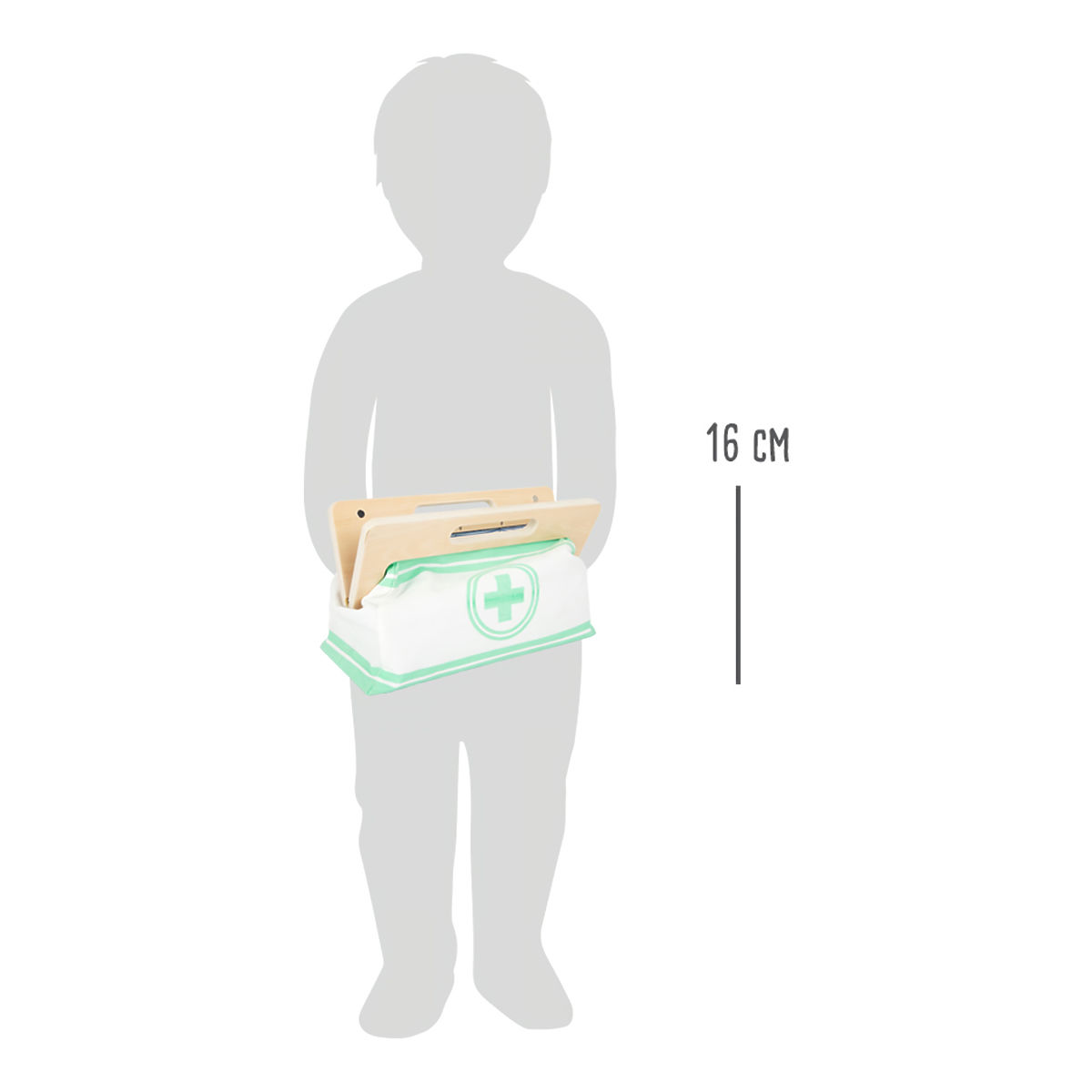 S touto standardní lékařskou brašnou budou mladí nadějní lékaři perfektně vybaveni. Brašna je vyrobená z měkkého textilu, je pěkná na pohled a také velmi funkční. Lze lehce otevřít díky magnetům, je vyrobena ze dřeva. Uvnitř brašny najdete všechno vybavení pro představivé ošetření pacientů: stetoskop, teploměr, stříkačku a mnoho dalšího – vše vyrobeno z pevného dřeva! Nejlepšími doplňky jsou zřejmě tlakoměr s manžetou a balónkem a otoskop s lupou. Tento obsáhlý set lékařských hraček obsahuje mnoho „opravdových“ lékařských nástrojů a přístrojů, s kterými si děti opravdu vyhrají. Ilustrace na lékařských pomůckách dětem poradí rozeznat nástroje a také jim možná zjednoduší jejich použití. Hlavní vlastnosti: Doktorská brašna s jasně viditelným dřevemTlakoměr s manžetou a balónkemTeploměr s nastavitelnou teplotouOtoskop s opravdovou lupouLahvička na léky se šroubovatelným víčkemNáplasti na suchý zipZnovu použitelné a pratelné dětské textilní rouškyDalší vybavení: injekční stříkačka s pohyblivým mechanismem, stetoskop, dezinfekce s pumpičkou, lahvička s léky a lžička, pinzeta, skalpel, reflexní kladivo