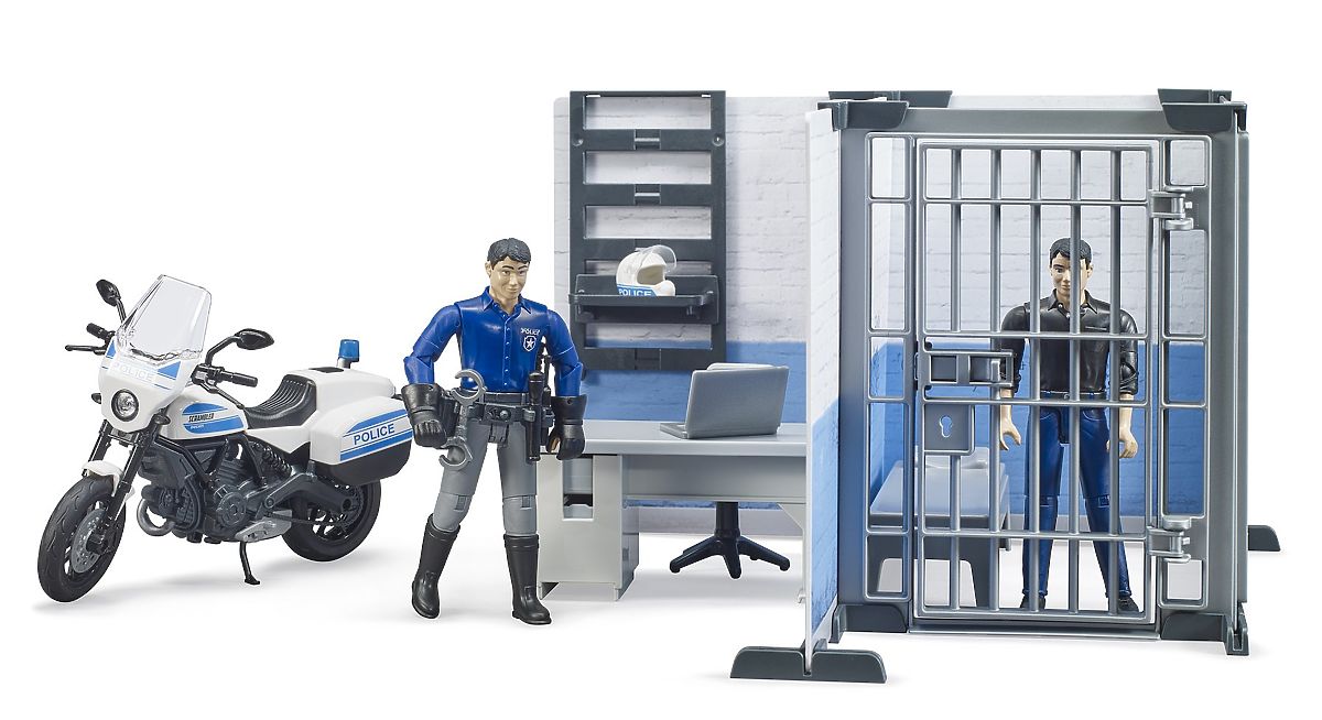 Pro širokou škálu policejních vozidel BRUDER je zde nová policejní stanice BWORLD jako koordinační centrum. V kancelářské části může policista koordinovat a sledovat každou misi pomocí nejmodernějšího vybavení. Je-li chycen podezřelý, může být zadržen cele. Policejní motocykl Scrambler Ducati před policejní stanicí je připraven vyrazit do akce. Stanici lze snadno kombinovat s ostatními sadami BWORLD. Nabízí se pro ni doplňky v podobě policejních vozidel. Vyrobeno v Německu, z kvalitních materiálů. Hlavní vlastnosti: figurka policisty s vybavením a motocyklem, figurka zadrženého2 oboustranně potištěné stěny stanice, 2 díly mřížoví včetně dveřípolicový díl, židle, stůl, postel a notebookvyrobeno v Německu
