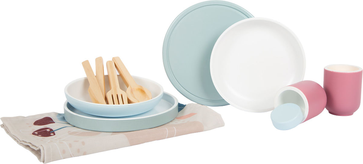 Moderní sada nádobí včetně talířů, šálků, příborů a prostírání pro dvě osoby. Vysoce kvalitní zpracování z robustního a odolného dřeva, které je vyrobeno tak, aby vám vydrželo. Nabízí další učební efekty s tištěným prostíráním, které ukazují, jak správně prostřít stůl. Moderní vzhled s lineárními tvary a kombinací přírodního dřeva s trendy barvami kouřově modré a bobulově červené. Dokonalá harmonie barvy a designu s kolekcí Tasty kde naleznete dětskou kuchyňku a další kuchyňské produkty. Pro obzvláště realistickou zábavu při hraní na role v dětské kuchyňce. Podporuje rozvoj jemné motoriky, sociálních dovedností a dalších každodenních dovedností. Díky vyváženému designu a modernímu barevnému schématu se obzvláště dobře hodí do moderního prostředí dětského i obývacího pokoje. Hlavní vlastnosti: Podporuje rozvoj jemné motoriky a sociálních dovedností Obsahuje 12 dílů