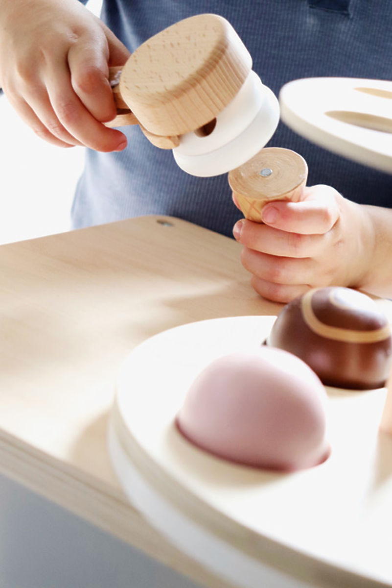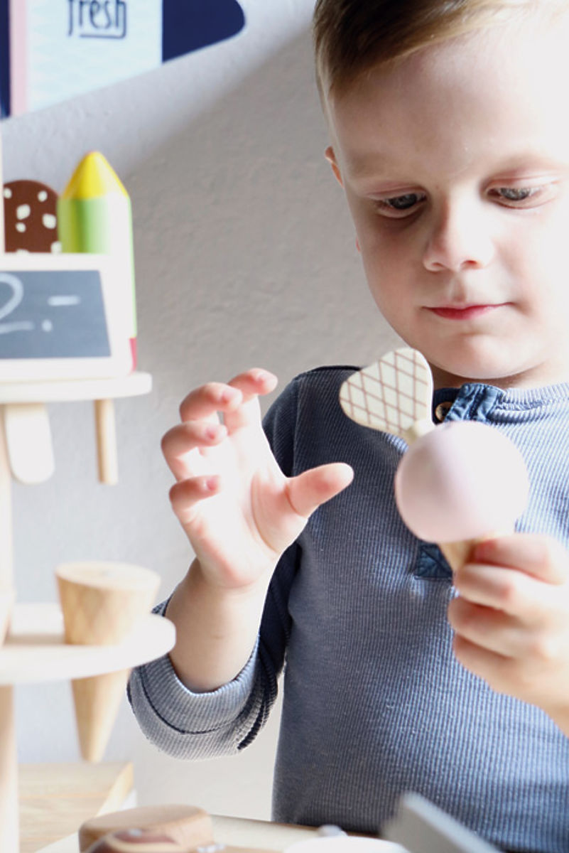 Naběračka zmrzliny s magnetickou funkcí. 8 různých druhů zmrzliny, od nanuků po lahodnou zmrzlinu. Kopečky zmrzliny jsou stohovatelné a vybavené magnety. Vaflová srdíčka a porce šlehačky na ozdobu zmrzlinových výtvorů. Všechny části zmrzlin se vejdou do barevně rozlišených míst na stojanu. Genderově neutrální, neokázalé barevné schéma se spoustou viditelného dřevěného materiálu. Dodává se s křídovou tabulkou na zapisování. Ideální doplněk k multifunkčnímu obchodu a dalším potravinám na hraní z produktové řady Fresh. Hlavní vlastnosti: Díly jsou opatřeny magnetyNa stojanu má vše své místoRozvíjí komunikační a sociální dovednosti dítěte