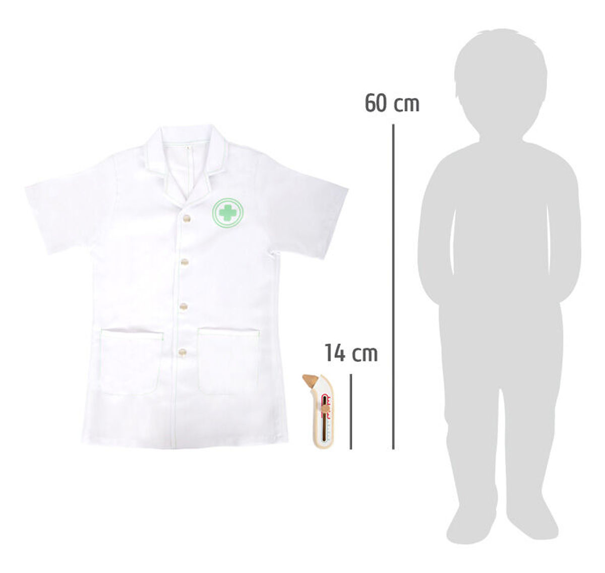 Kompletní hrací sada s lékařským plášťem a zdravotnickým vybavením. Najdete zde injekční stříkačku, stetoskop a teploměr z robustního dřeva. Píst stříkačky se po stlačení zatáhne. Teploměr má nastavitelný ukazatel teploty. Lékařský plášť má dvě praktické kapsy, zapíná se na patentky, takže si jej mohou mladí medici rychle obléct i svléct. Ideální hračka pro hraní na role nebo jako kostým na karneval. Vhodné pro děti, které jsou vysoké 105-110 cm (vel. 110). Ideální doplněk k doktorské brašně a dalším podobným produktům. Hlavní vlastnosti: lékařský plášť a další doplňkypro děti vysoké 105-110 cmperfektní pro hraní na role nebo na karneval