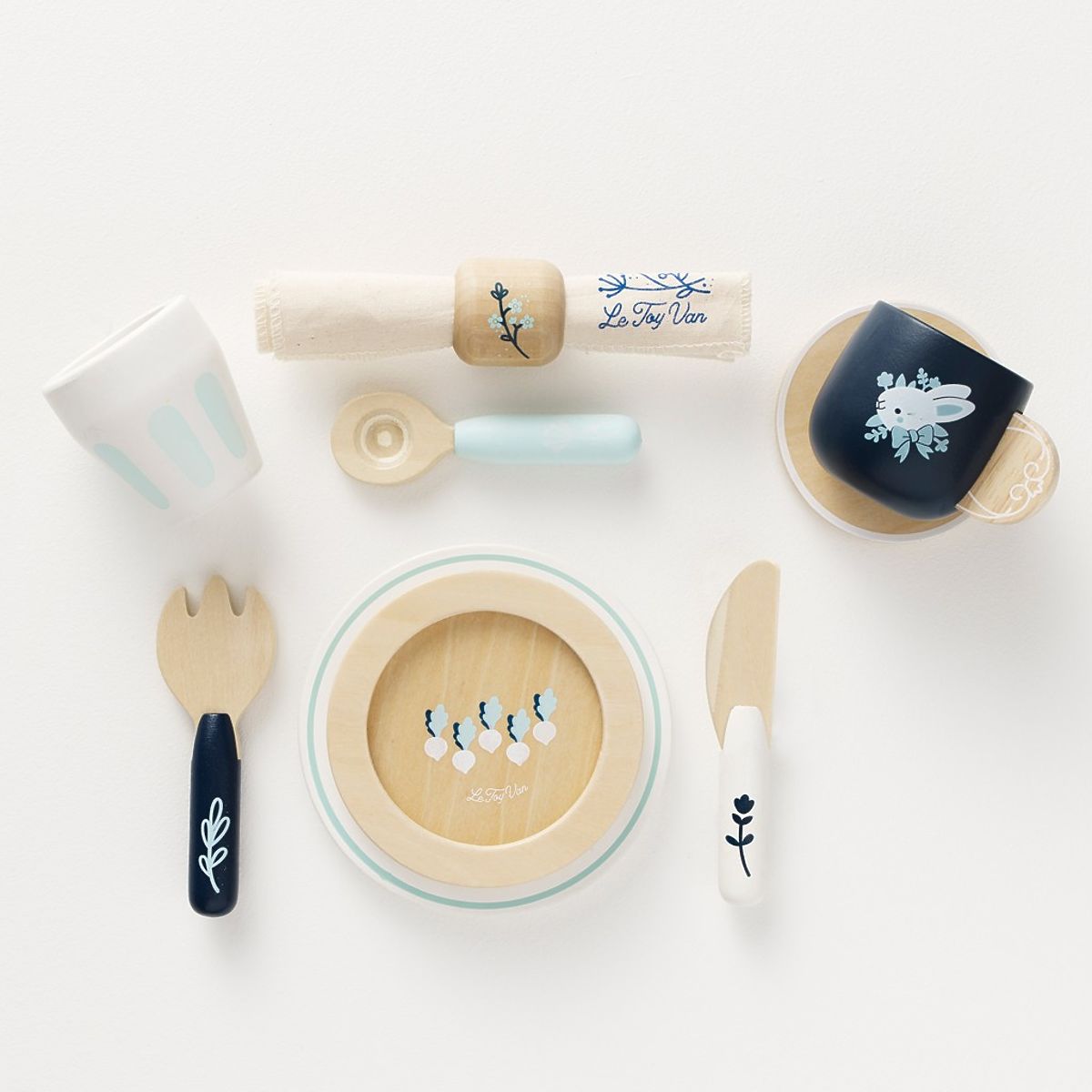 Oběd chutná lépe, když je servírován na pěkném nádobí. Tato hračka je udržitelná a vydrží vám opravdu dlouho. Přírodní barva dřeva, bílá a odstíny modré k sobě pěkně ladí, nechybí ani ilustrace rostlinek. V sadě najdete hrnek, podšálek, kelímek, 2 talíře, nůž, vidličku, lžíci a ubrousek s dekorativním kroužkem. Děti si při představivé hře procvičí jemnou motoriku, zručnost a koordinaci ruka-oko. Malováno netoxickými barvami na bázi vody. Hračky s účelemVšechny hračky firmy Le Toy Van jsou vyrobeny s cílem – aby dlouho vydržely. Designovány s láskou zkušenými řemeslníky za použití etických praktik a udržitelných materiálů, které jsou laskavější k naší planetě. Hlavní vlastnosti: vyrobeno eticky z udržitelného dřevatestováno dle nejpřísnějších standardůmalováno netoxickými barvami na bázi vodyinspiruje k představivé hřerozvíjí kognitivní dovednosti Honeybake kolekce: Hračky v této kolekci jsou vhodné k objevování, pomohou dětem s rozvojem představivosti, sociálních a verbálních dovedností a kognitivních funkcí. Tradiční design s moderními detaily děti jistě bude bavit. Honeybake je kolekce Le Toy Van, která vyhrála nejvíce ocenění, a to za design, kvalitu, bezpečnost a také za vzdělávací a herní hodnotu. Značka a certifikát FSC® (Forest Stewardship Council) zaručuje, že dřevo, ze kterého byl produkt vyroben, nebylo vytěženo nelegálně a pochází z lesů obhospodařovaných šetrným či přírodě blízkým způsobem, ve kterém jsou dodržovány přísné environmentální a sociální požadavky. Značka FSC® na výrobku znamená, že svým nákupem pomáháte chránit lesy a podporujete šetrné, odpovědné či přírodě blízké hospodaření, díky kterému jsou naše lesy stabilnější, zdravější, mají přirozenou druhovou skladbu a lépe odolávají negativním následkům klimatických změn.