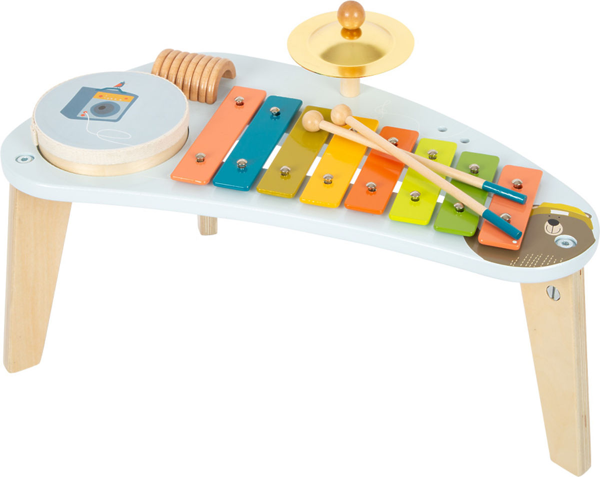 Medvěd Bruno vytváří hudbu! Tento robustně zkonstruovaný hudební stoleček stojí na třech nohách a povzbuzuje děti, aby hrály na různé nástroje a objevovaly nové zvuky s činely, xylofonem, chrastítkem a odnímatelným bubnem. Klapky xylofonu jsou barevně odlišeny, takže první písničky jsou pro děti snadné! Dodává se s robustními paličkami z masivního dřeva a notami. Je to spousta motivující hudby a zábavné učení! Vizuálně tento hudební a zvukový stoleček vyniká svým veselým designem a harmonickou kombinací přírodního dřeva a moderních modrých barev! Kromě nácviku akustického vnímání tento nástroj hravě trénuje i smysl pro rytmus, rytmiku a první porozumění hudebním tónům. Hlavní vlastnosti: Rozvíjí jemnou motoriku a kreativituHravý úvod do světa zvuku a rytmuKlapky xylofonu vydávají odlišné tónyStoleček vše v jednom