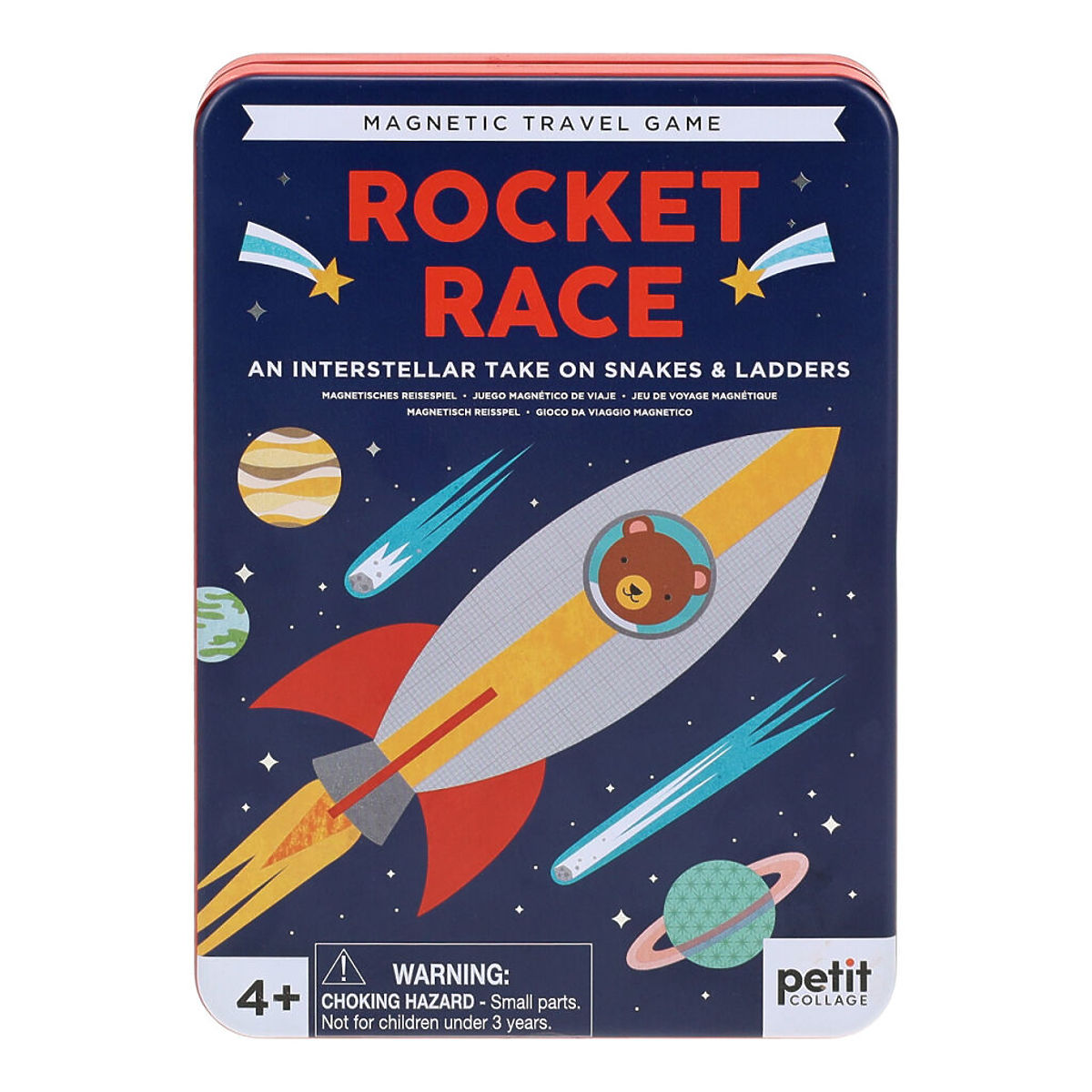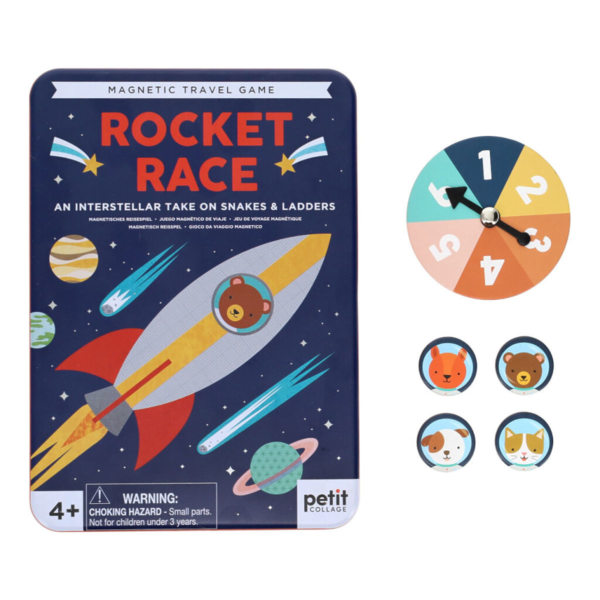 Odstartuje tento vesmírný závod! Zábavná hra v kovové krabičce plná veselých ilustrací. Hra je vesmírnou verzí Hadů a žebříků. Střídejte se v otáčení kolečka s šipkou, to ukazuje, o kolik polí se posunete. Pokud se zastavíte na políčku s hořícím palivem rakety, posuňte se vzhůru na tělo rakety. Snažte se vyhnout ohonu komety, pokud se na takovém poli zastavíte, padáte dolů, na její jádro. Zabaleno v recyklovatelné kovové krabičce, otevírání na panty. Po otevření odhalíte ilustrovanou hrací desku, 4 magnetické dílky, 1 kolečko s šipkou, návod hry. Vhodné pro 2-4 hráče od 4 let. Hlavní vlastnosti: cestovní magnetická hratrénuje trpělivostkrabička slouží jako hrací plocha