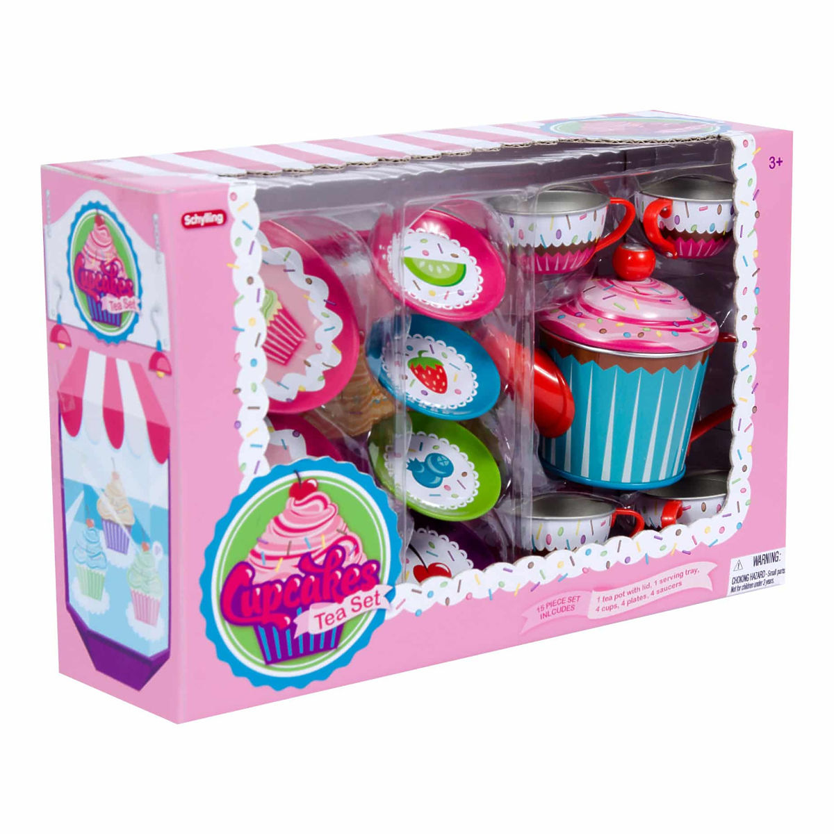 Je čas na čaj. Krásná 15 dílná čajová sada vyrobená z kovu, obsahuje 4 šálky s podšálky, 4 dezertními talířky, konvici na čaj s pokličkou a servírovací tác, vše v designu zdobených muffinů. Rozměr servírovacího tácku je 24x16 cm. Kreativita stoupá, když Vaše ratolesti hostí kamarády, panenky a plyšové hračky s nejsladší čajovou sadou všech dob. Vhodné pro malé hostitele a hostitelky ve věku od 3 let. Hlavní vlastnosti: 15dílná čajová sadaideální pro předstírané čajové dýchánkydesign s motivem muffinů