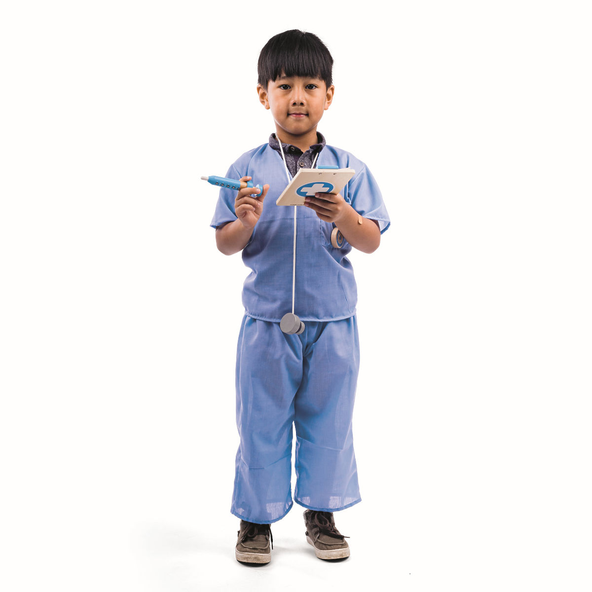 Pomozte dětem ošetřovat medvídky, panenky nebo členy rodiny s tímto realisticky vypadajícím kostýmem zdravotníka pro děti. Součástí tohoto lékařského převleku je modré triko, kalhoty, dřevěný stetoskop, lékařské desky, kde si mohou děti zapsat diagnostické poznámky, teploměr, kapesní hodinky a injekční stříkačka a také náplasti. Suché zipy pro snadné oblékání a svlékání kostýmu. Kostým je vyroben z bavlny a polyesteru, lze prát v pračce. Hlavní vlastnosti: ideální pro ošetřování nemocných medvídků nebo panenekpomáhá s rozvojem představivosti, řeči a sociálních dovedností napomáhá zmírnit strach a obavy z návštěvy lékaře
