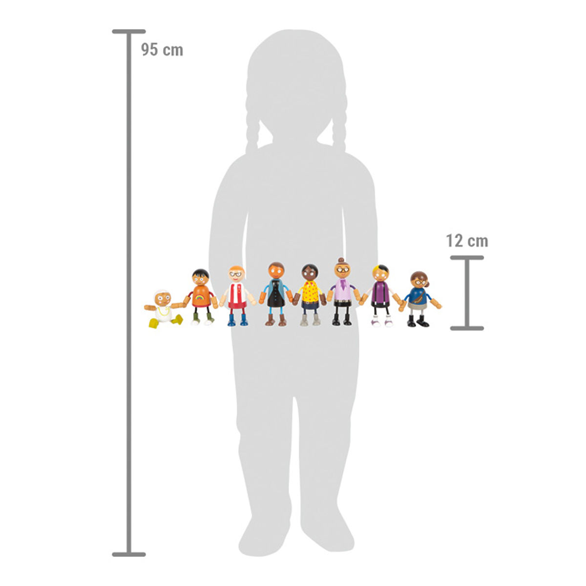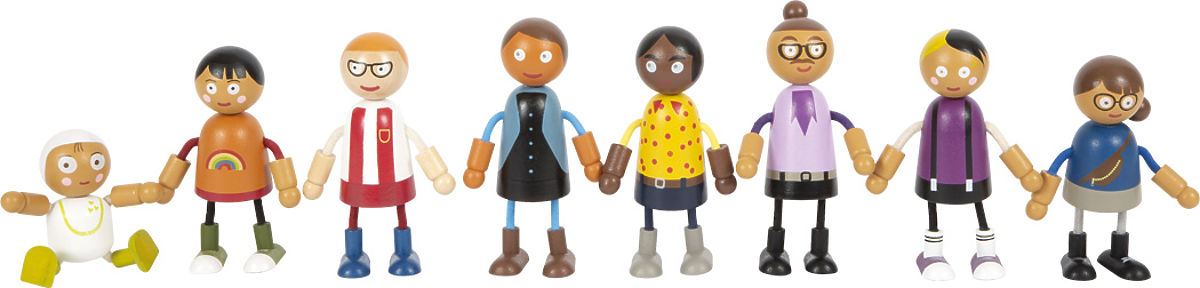 Tato velká rodina dřevěných ohýbacích panenek je vhodná do každého domečku pro panenky. Skládá se z 8 rodinných příslušníků různého pohlaví a věku. Ohýbací panenky mají hlavu a tělo vyrobenou z masivního dřeva, zatímco jejich ruce a nohy jsou textilní, ohebné. Dva páry rodičů, tři děti a miminko v nosítku, které lze připevnit k ostatním ohýbacím panenkám, nabízejí spoustu různých herních možností. Aktivní hraní rolí učí děti zábavnou formou, jak rozmanitý může být životní styl. Hraní rolí podporuje rozvoj identifikace, komunikace, představivosti a sociálních i emocionálních dovedností. Ohýbací panenky jsou svou velikostí snadno uchopitelné pro malé dětské ručičky. Ideální doplněk k městské vile s domečkem pro panenky (11802) kompaktní městské vile (12277). Hlavní vlastnosti: 8členná flexibilní rodinka panenek podporuje představivost, kreativitu a sociální dovednostirealistická zábava díky ohebným pažím a nohámflexibilní, robustní s bohatými detailyvelikost figurky je snadno uchopitelná pro dětské ruce