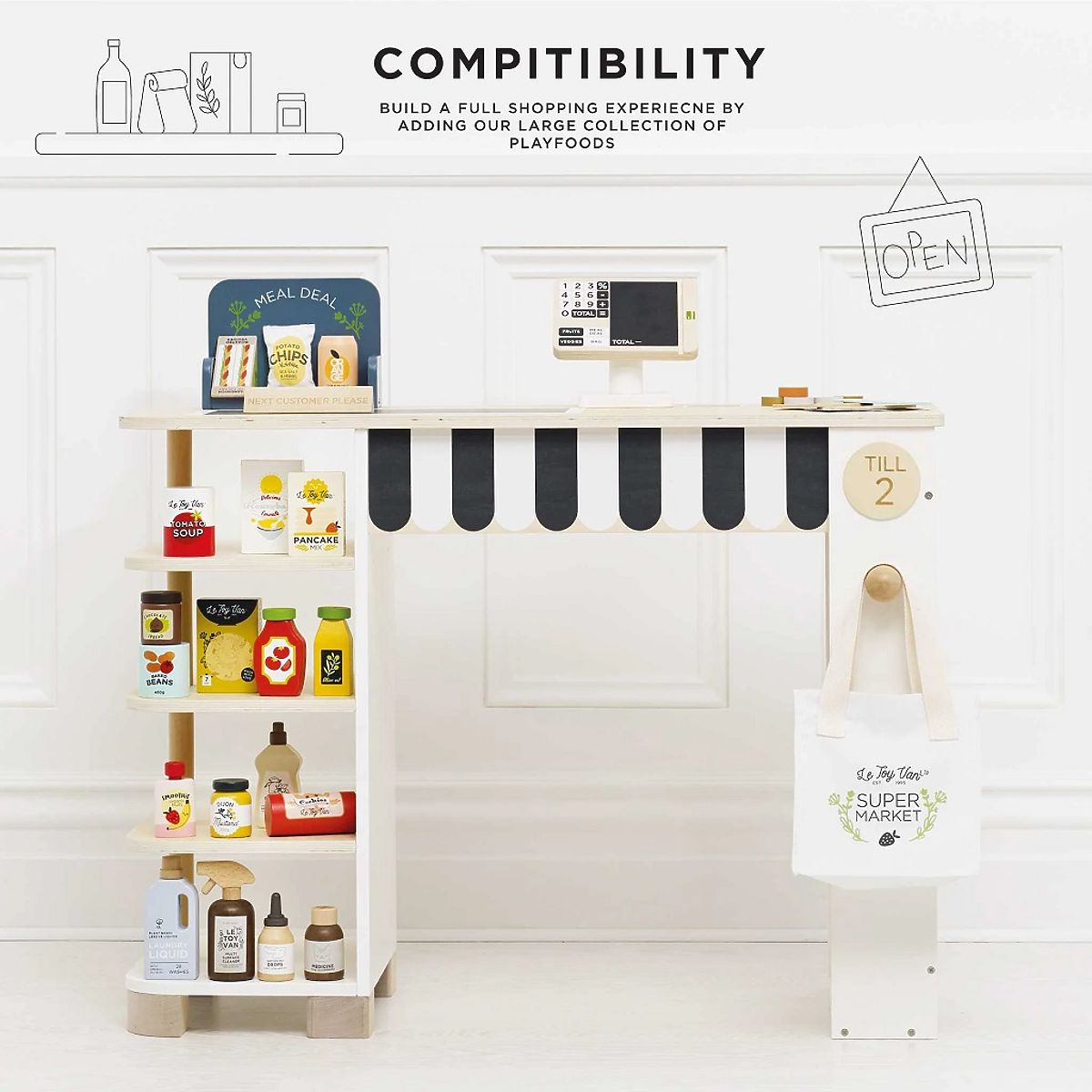Tento prodejní stánek má vše, co si jen můžete přát, abyste si v pohodlí domova vytvořili perfektní nákupní zážitek. Součástí je regál, na který lze umístit různé potraviny. Dodáváno s kompletní sadou realistických potravin obsahující např. osvěžující plechovku nápoje, sáček lupínků, kečup, hořčici, těstoviny...což slibuje autentický zážitek z nakupování pro všechny, kteří rádi nakupují. Aby byl zážitek ještě zajímavější, je tu navíc elegantní pokladna, dále popisovací tabule, pásový dopravník, skener, hrací peníze, nápis "příští zákazník", křídová tabule se speciální nabídkou, bavlněná "taška na celý život" a platební, odměnové a věrnostní karty. Všechny díly jsou vyrobeny z udržitelných materiálů, včetně dřeva s certifikací FSC a přírodní bavlny. Sada je 100% bez plastu. Hračky s účelemVšechny hračky firmy Le Toy Van jsou vyrobeny s cílem – aby dlouho vydržely. Designovány s láskou zkušenými řemeslníky za použití etických praktik a udržitelných materiálů, které jsou laskavější k naší planetě. Hlavní vlastnosti: multifunkční, různorodé využitírozvíjí komunikační a sociální dovednosti dětívyrobeno ze dřeva s certifikací FSC®včetně bohatého příslušenství100% bez plastu Značka a certifikát FSC® (Forest Stewardship Council) zaručuje, že dřevo, ze kterého byl produkt vyroben, nebylo vytěženo nelegálně a pochází z lesů obhospodařovaných šetrným či přírodě blízkým způsobem, ve kterém jsou dodržovány přísné environmentální a sociální požadavky. Značka FSC® na výrobku znamená, že svým nákupem pomáháte chránit lesy a podporujete šetrné, odpovědné či přírodě blízké hospodaření, díky kterému jsou naše lesy stabilnější, zdravější, mají přirozenou druhovou skladbu a lépe odolávají negativním následkům klimatických změn. Honeybake kolekce: Hračky v této kolekci jsou vhodné k objevování, pomohou dětem s rozvojem představivosti, sociálních a verbálních dovedností a kognitivních funkcí. Tradiční design s moderními detaily děti jistě bude bavit. Honeybake je kolekce Le Toy Van, která vyhrála nejvíce ocenění, a to za design, kvalitu, bezpečnost a také za vzdělávací a herní hodnotu.