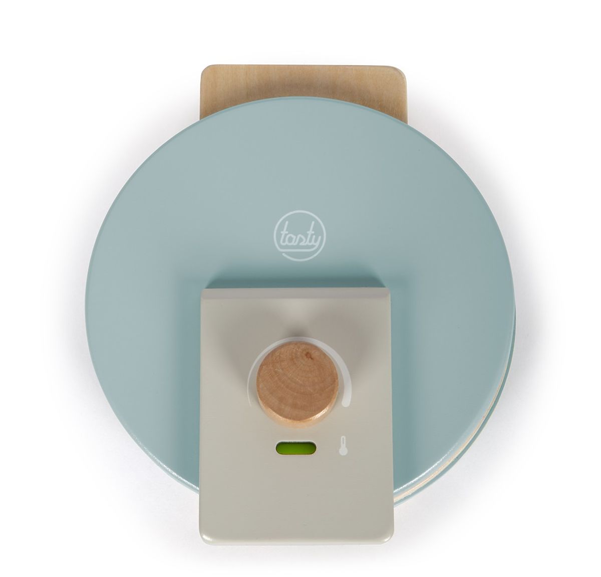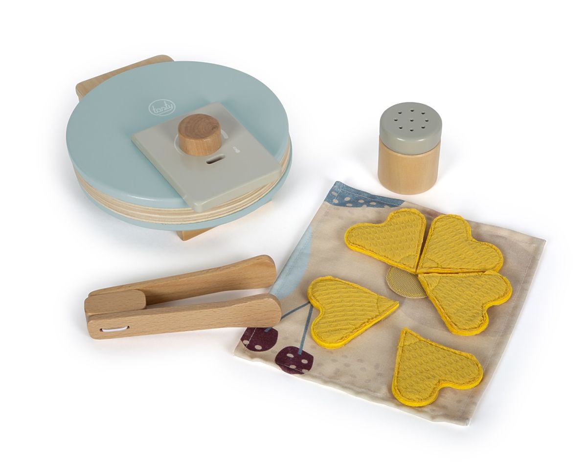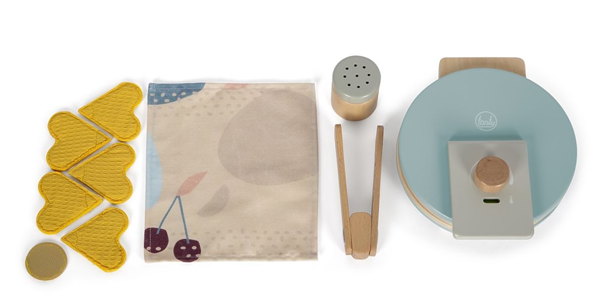 Dali byste si vafle? Se sadou na přípravu vaflí s bohatým příslušenstívm to nebude žádný problém. Váš malý kuchař nebo kuchařka mohou připravit najednou až pět vaflí ve tvaru srdce. Jsou vyrobeny z látky, uprostřed spojeny suchým zipem a vypadají jako opravdové. Při otáčení knoflíku na vaflovači se barva kontrolky mění z červené na zelenou a kuchař tak pozná, jestli už jsou vafle správně propečené. Součástí sady je látkový ubrousek, kleště a cukřenka na posypání vaflí, která při sypání vydává štěrkavý zvuk. Hlavní vlastnosti: vhodné do dětské kuchyňkypodporuje kreativní a nápadité hraní plné fantazietrénuje sociální dovednostimoderní barvy ve skandinávském stylu