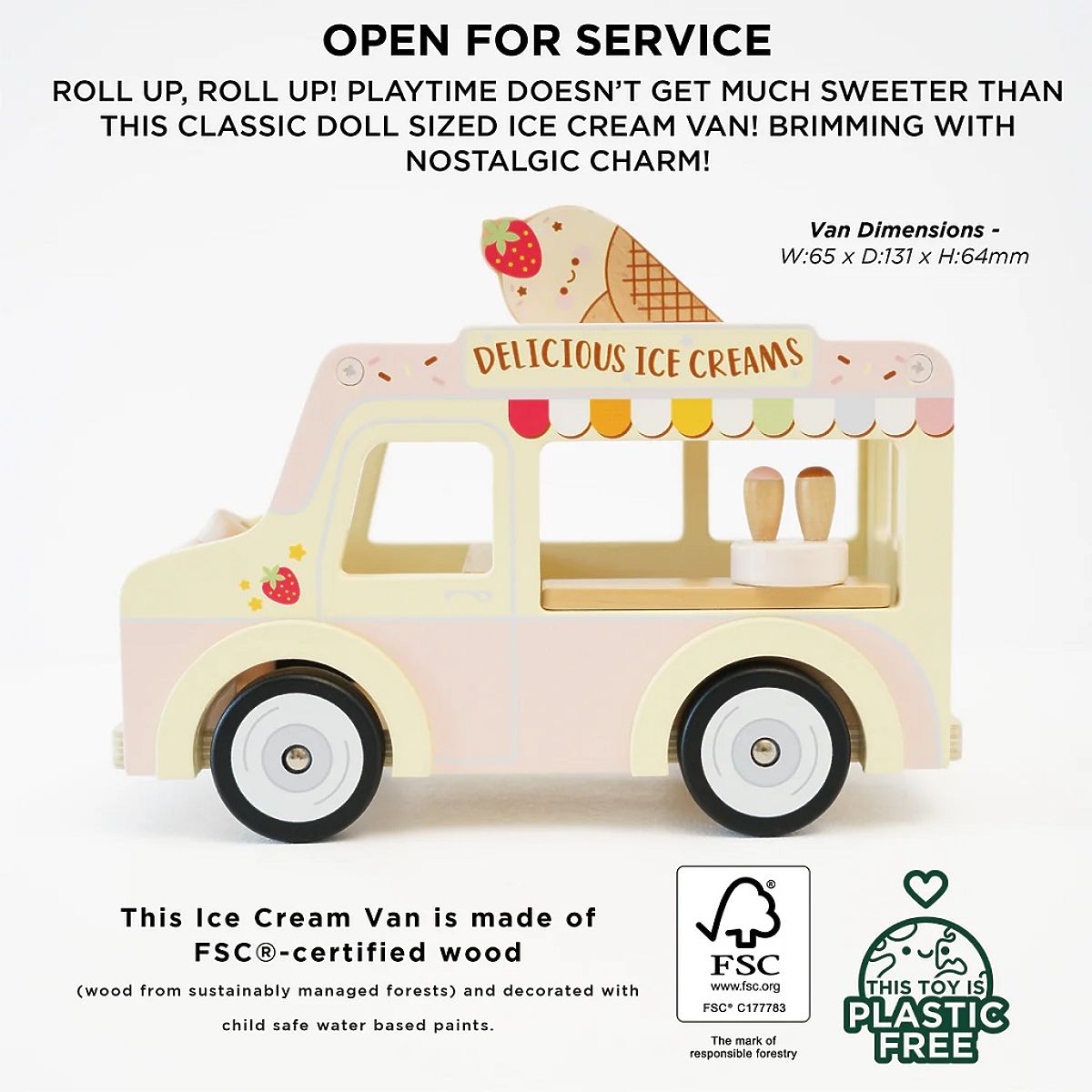 Dva kopečky, prosím! S mini zmrzlinovým vozem si děti užijí sladkou zábavu. Hračka ve vintage stylu má mnoho interaktivních prvků, včetně nálepek, kterými si děti mohou vůz vyšperkovat. Odklopitelná střecha a okno se servírovacím pultem jsou jako stvořené pro hru na role. Vyrobeno z odolného a udržitelného kaučukového dřeva, hodí se nejen k domečkům pro panenky od Le Toy Van. Vhodné pro figurky do 10 cm. Hračky s účelemVšechny hračky firmy Le Toy Van jsou vyrobeny s cílem – aby dlouho vydržely. Designovány s láskou zkušenými řemeslníky za použití etických praktik a udržitelných materiálů, které jsou laskavější k naší planetě. Hlavní vlastnosti: vyrobeno eticky z udržitelného dřevatestováno dle nejpřísnějších standardůmalováno netoxickými barvami na bázi vodyinspiruje k představivé hřerozvíjí kognitivní dovednosti Hračka získala prestižní ocenění hračky roku Right Start Best Toy Awards Winner. Daisylane kolekce: Prestižní kolekce domečků pro panenky a doplňků firmy Le Toy Van. Před více než 25 lety zakladatel Georges navrhl svůj úplně první domeček pro panenky, stavební kámen této firmy. Vyrobeno eticky z udržitelných materiálů, dřevěné domečky pro panenky Daisylane jsou jedinečné a nebudou dětskou představivost držet zpátky. Rodinné dědictví, opravdová investice do hraní. Značka a certifikát FSC® (Forest Stewardship Council) zaručuje, že dřevo, ze kterého byl produkt vyroben, nebylo vytěženo nelegálně a pochází z lesů obhospodařovaných šetrným či přírodě blízkým způsobem, ve kterém jsou dodržovány přísné environmentální a sociální požadavky. Značka FSC® na výrobku znamená, že svým nákupem pomáháte chránit lesy a podporujete šetrné, odpovědné či přírodě blízké hospodaření, díky kterému jsou naše lesy stabilnější, zdravější, mají přirozenou druhovou skladbu a lépe odolávají negativním následkům klimatických změn.