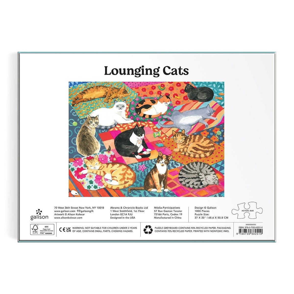 Puzzle o 1000 dílcích zobrazuje rozmanitý výběr kočičích společníků, kteří lenoší na barevných přikrývkách a polštářích. Autorkou obrázku je umělkyně a ilustrátorka Alison Kolesar. Ideální pro všechny milovníky koček a puzzle nadšence! Puzzle jsou vyrobeny za použití významného podílu recyklovaného papíru a nabízí špičkový potisk nezávadnými barvami. Jsou opatřeny matnou povrchovou úpravou, která zajišťuje za všech okolností věrné podání detailů i barev. Jejich zadní strana je potažena hladkým, na dotek příjemným povrchem, díky němuž se při skladování rozloženého puzzle netvoří prach. Spolu s pečlivě zabalenými dílky naleznete v balení také letáček s návodným obrázkem. Dodáváno v mimořádně pevné a poutavě zpracované kartonové krabičce vyrobené z recyklovaného kartonu a udržitelně získaných materiálů s certifikací FSC®. Hlavní vlastnosti: 1000 precizně vyřezaných dílkůvyrobeno s použitím recyklovaných a udržitelně získaných materiálůpečlivě vybraný motiv od renomovaných tvůrců a umělcůpotisk a provedení nejvyšší kvalityobsahuje návodný obrázek Značka a certifikát FSC® (Forest Stewardship Council) zaručuje, že dřevo, ze kterého byl produkt vyroben, nebylo vytěženo nelegálně a pochází z lesů obhospodařovaných šetrným či přírodě blízkým způsobem, ve kterém jsou dodržovány přísné environmentální a sociální požadavky. Značka FSC® na výrobku znamená, že svým nákupem pomáháte chránit lesy a podporujete šetrné, odpovědné či přírodě blízké hospodaření, díky kterému jsou naše lesy stabilnější, zdravější, mají přirozenou druhovou skladbu a lépe odolávají negativním následkům klimatických změn.