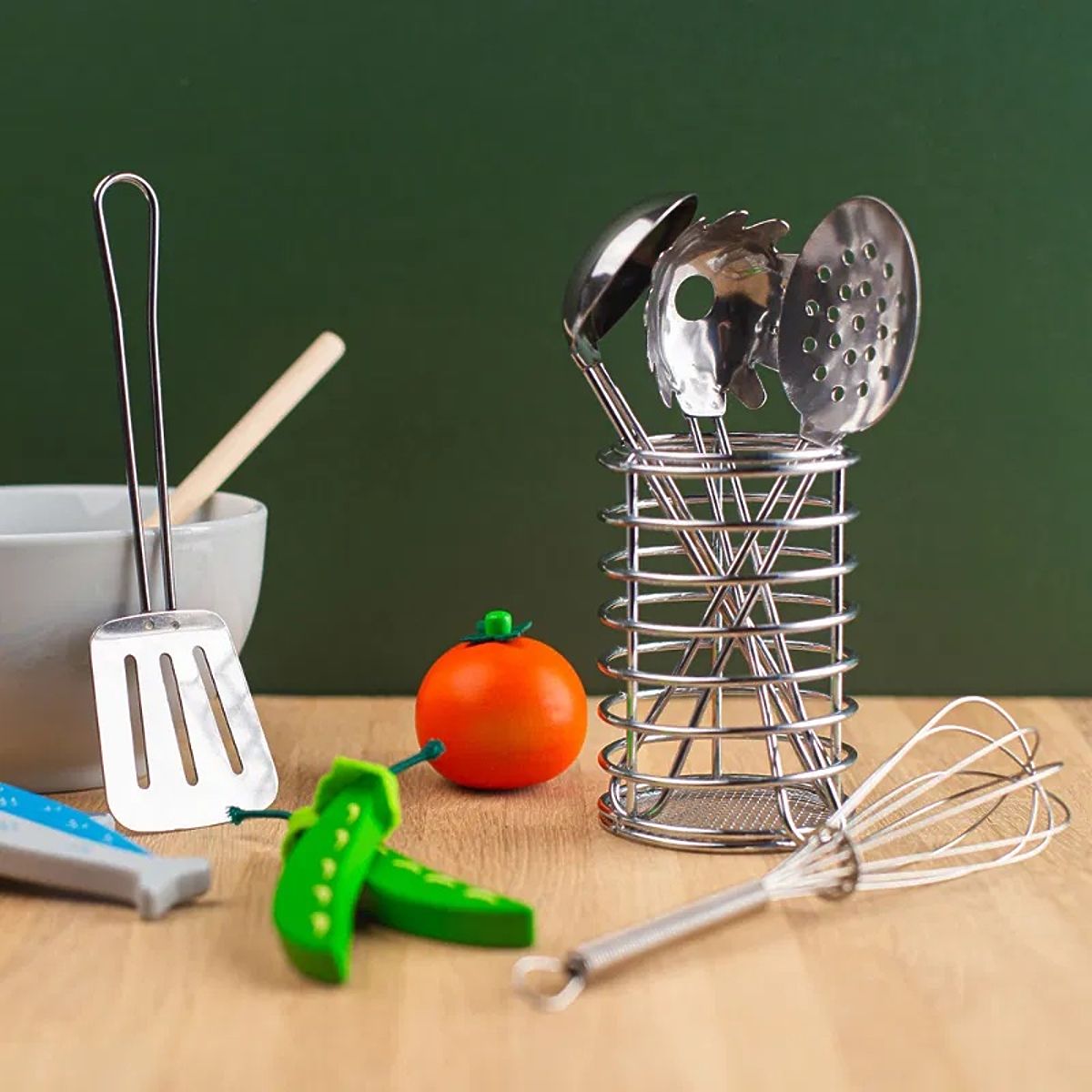 Za pomoci sady kuchyňského náčiní bude vaření a pečení hračkou! Sada určená pro malé kuchaře a kuchařky obsahuje šest náčiní pro děti včetně obracečky, děrované lžíce, naběračky, šlehací metly, naběračky na špagety a vařečky, uložené v praktické válcové nádobě. Děti mohou šlehat, míchat a servírovat a vyzkoušejí si různé kuchyňské činnosti a podpoří tak svou kreativitu. Hraní na role je skvělý způsob, jak rozvíjet sociální inteligenci, jazykové schopnosti, kreativní myšlení a komunikační dovednosti. Manipulace s kuchyňským náčiním zlepšuje jemnou motoriku a koordinaci ruka-oko. Náčiní je vyrobeno z prvotřídních kvalitních materiálů z odpovědných zdrojů a nabarveno netoxickými barvami a laky. Splňuje aktuální evropské bezpečnostní normy. Hlavní vlastnosti: 6 ks kuchyňského náčiní v nádobě: obracečka, děrovaná lžíce, naběračka, šlehací metla, naběračka na špagety a vařečkarozvíjí sociální inteligenci, jazykové schopnosti, kreativní myšlení a komunikační dovednostizlepšuje jemnou motoriku a koordinaci ruka-okopodporuje hraní na rolevyrobeno z vysoce kvalitních materiálůvhodné od 3 let věku