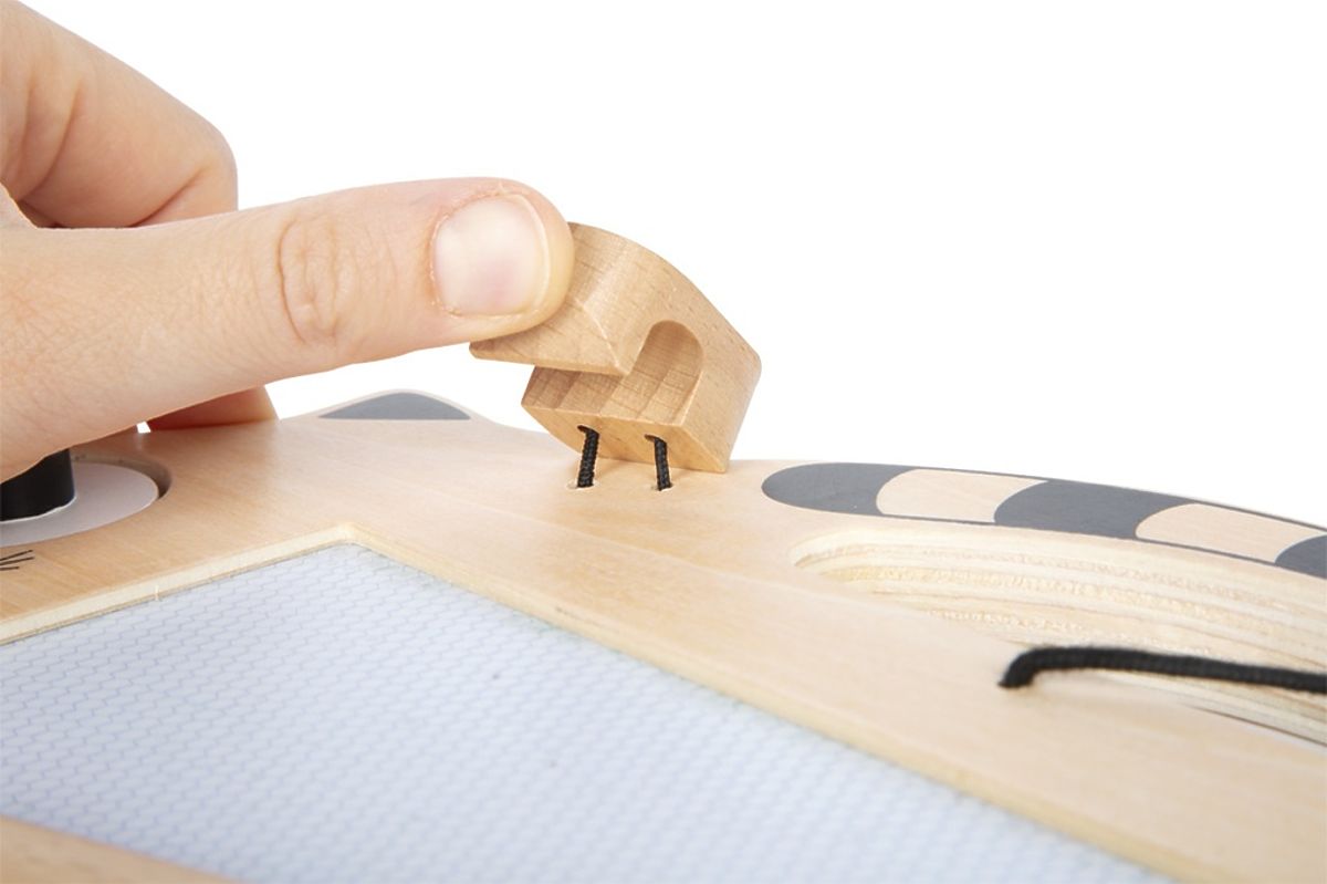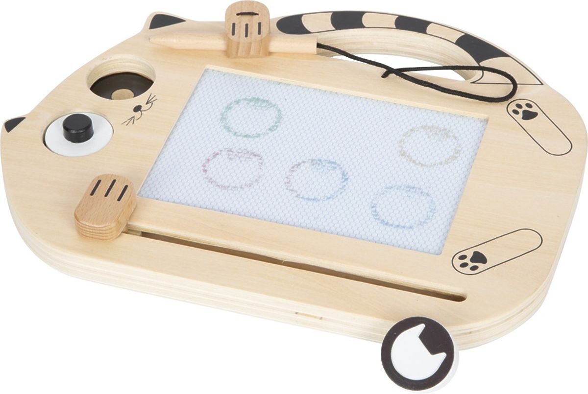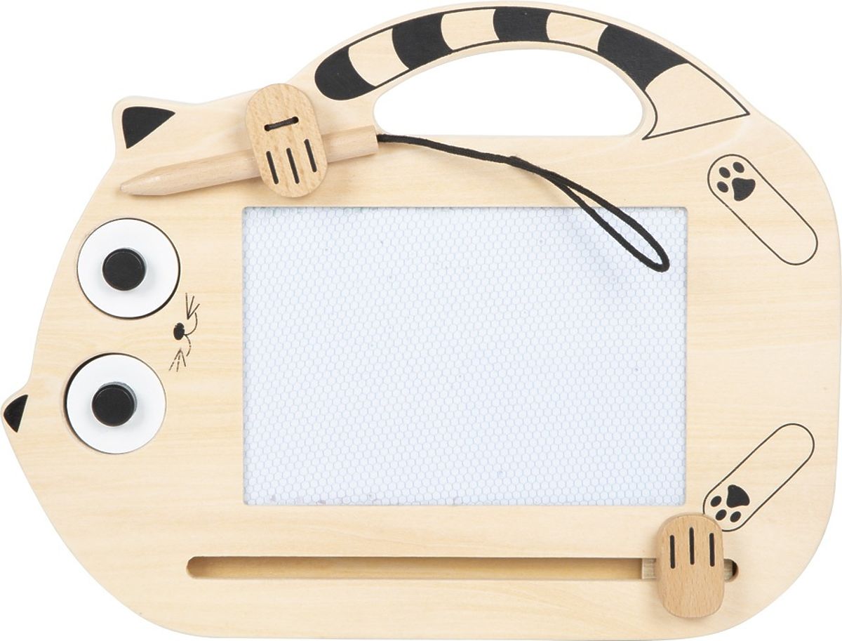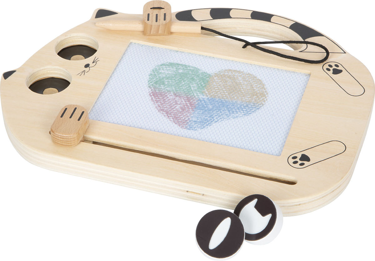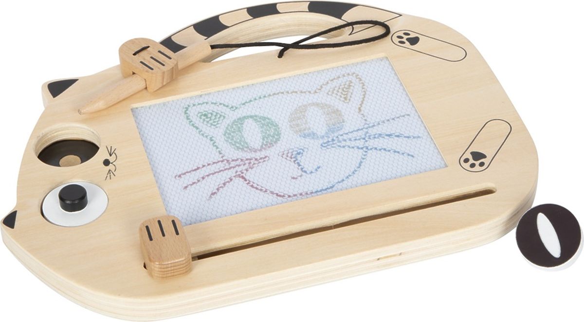 Kreativní zábava pro malé umělkyně a umělce! Magnetická kreslící tabulka ve tvaru kočky je ideální pro děti, které milují kreslení. Pomocí pera lze znovu a znovu vytvářet nové obrázky. Dvě razítka s motivy kočičích očí a kočičí hlavy nabízejí další možnosti vytváření jedinečných uměleckých děl. Když se pero nepoužívá, lze jej bezpečně upnout pod kočičí tlapku, a díky tomu, že je k tabulce připevněno šňůrkou, se neztratí. Když je mistrovské dílo dokončeno nebo chcete vytvořit něco nového, lze obraz jednoduše smazat pomocí posuvníku – takže je vše během chvilky připraveno pro další tvorbu! Díky integrovanému držadlu pro přenášení a kompaktním rozměrům lze tabulku vzít kamkoli. Užijte si kreativní zábavu, která nekončí ani na cestách! Hlavní vlastnosti: s dřevěným perem a 2 razítkypero na šňůrce k tabulce přichyceno tlapkounekonečné kreslení s magickou gumous držadlem pro přenášenívyrobeno z vysoce kvalitního dřevavhodné i na cesty