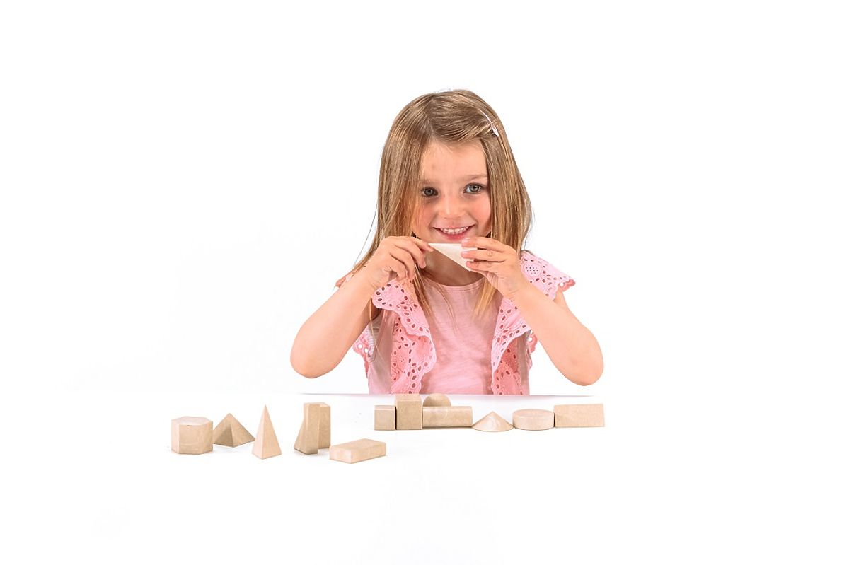 14 různých dřevěných geometrických těles, které slouží ke hraní, ale jsou vhodné také jako učební pomůcka. Rozpoznáte a pojmenujete je správně všechny? Díky těmto kostkám získá dítě pojem o slovech jako je plocha, hrana, roh, strana, úhlopříčka, úsečka, pravý úhel či kolmice. Ukažte mu, jak vypadá krychle, kvádr, hranol, válec, jehlan, kužel či koule. Vyrobeno ze 100% recyklovaných materiálů, má certifikaci PEFC a po použití jej lze opakovaně recyklovat. Hlavní vlastnosti: obsahuje 14 dílůvhodné jako učební pomůcka k ranému učení geometrievyrobeno v Německu