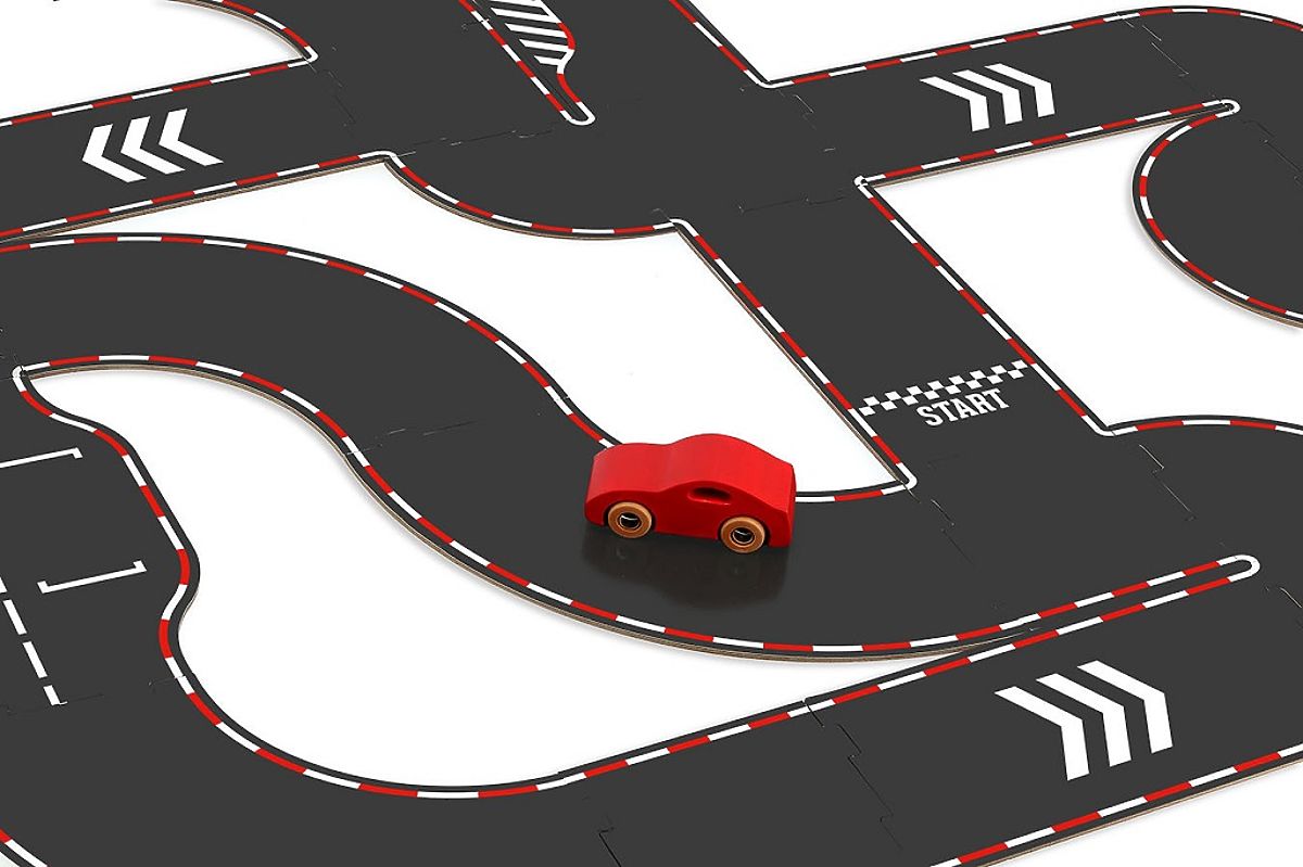 Oboustranný kartonový okruh nabízí dětem dvě různé herní plochy – závodní dráhu a klasickou silnici. Tato variabilita rozšiřuje možnosti hry a podporuje .. více