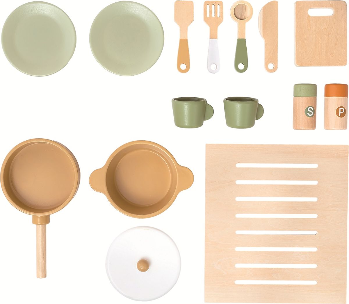 Je libo teplý domácí koláček? Nebo snad máte chuť na něco smaženého? S touto kuchyňkou můžete mít menu dle Vašeho přání. Je totiž plně vybavená! Najdete zde vše, co v moderní kuchyni nesmí chybět - sporák s troubou, výrobník ledu, mikrovlnku, dřez, kávovar a samozřejmě nádobí s náčiním, jako jsou talíře, hrnec, pánev, hrnečky, nůž, naběračka a další. Díky otevíracím dvířkům a otočným knoflíkům je požitek ze hry ještě realističtější. Vše je vyrobeno z kvalitního pevného dřeva a ošetřeno netoxickými barvami. Tak si nasaďte kuchařskou čepici, oblečte zástěru a dejte se do vaření! Obsah balení: 2x talíř, 2x hrneček, 1x pánev, 1x hrnec, 1x poklička, 1x pepřenka, 1x solnička, 1x prkýnko, 4 ks náčiní, rošt do trouby. Hlavní vlastnosti: součástí je bohaté příslušenstvímultifunkční, rozmanité využitírozvíjí komunikační a sociální dovednostimotivuje k představivé hřevhodné pro děti do 3 let