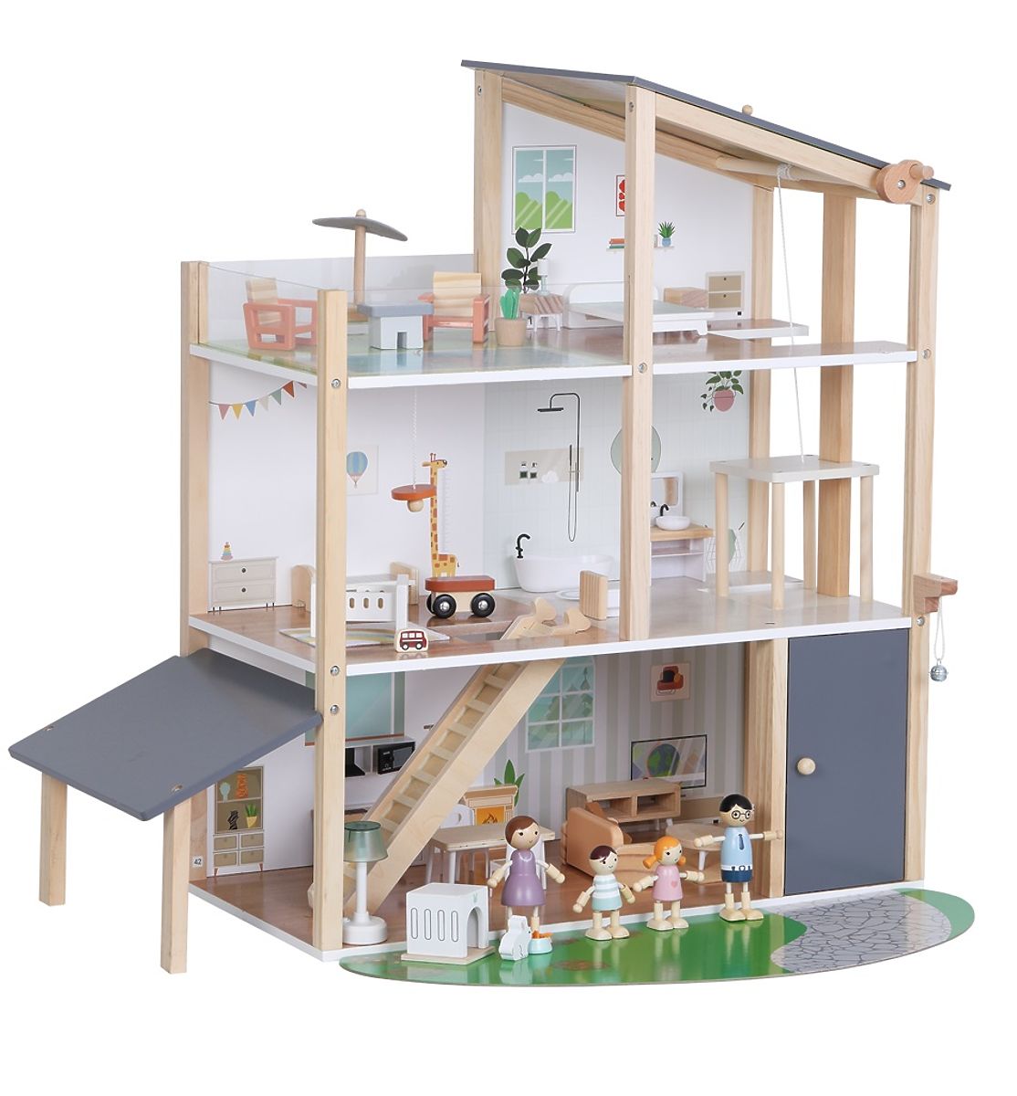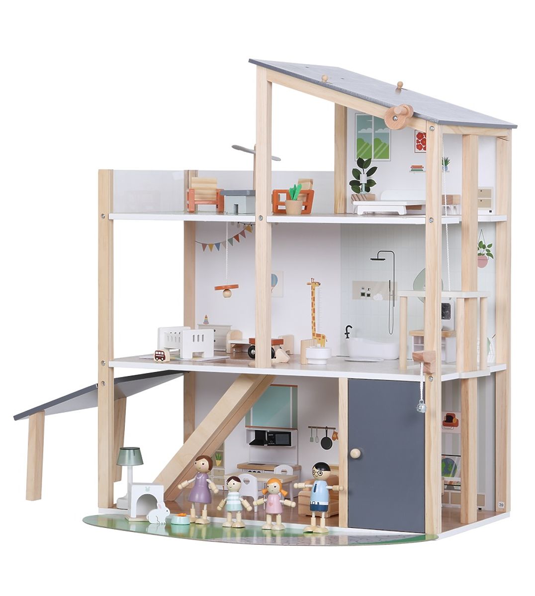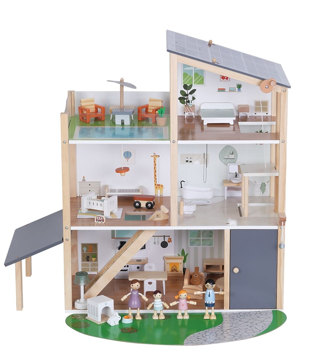 Vítejte v domečku, kde se bydlí jedna radost! Prostorný dřevěný domek je plně vybavený nábytkem i doplňky. Najdete v něm prostornou kuchyni propojenou s útulným obývacím pokojem, stylovou koupelnu s vanou, dětský pokojíček, ložnici i luxusní střešní terasu pro chvíle pohody. A aby toho nebylo málo, nechybí ani výtah. Zatočte kličkou a vyvezte rodinku až do druhého patra. Součástí sady je roztomilý domácí mazlíček králíček s vlastním domečkem a čtyřčlenná rodina připravená zabydlet se a začít psát svůj příběh. Děti si při hře rozvíjejí fantazii, sociální dovednosti i smysl pro detail. A hlavně se výborně baví! Hravý design, jemné barvy spolu s kvalitním provedením dělají z této hračky krásný doplněk každého pokojíčku nebo herny. Domeček je dodáván v rozloženém stavu a vyžaduje montáž. Návod k sestavení je součástí balení. Hlavní vlastnosti: 41 dílůplně vybavený dřevěný domeček se 4 figurkami rodinypodporuje fantazii, tvořivost a hru na rolevede k představivé hřekvalitní zpracování a atraktivní designdodáváno v rozloženém stavu, nutná montážnávod k sestavení je součástí balenívhodné pro děti od 3 let
