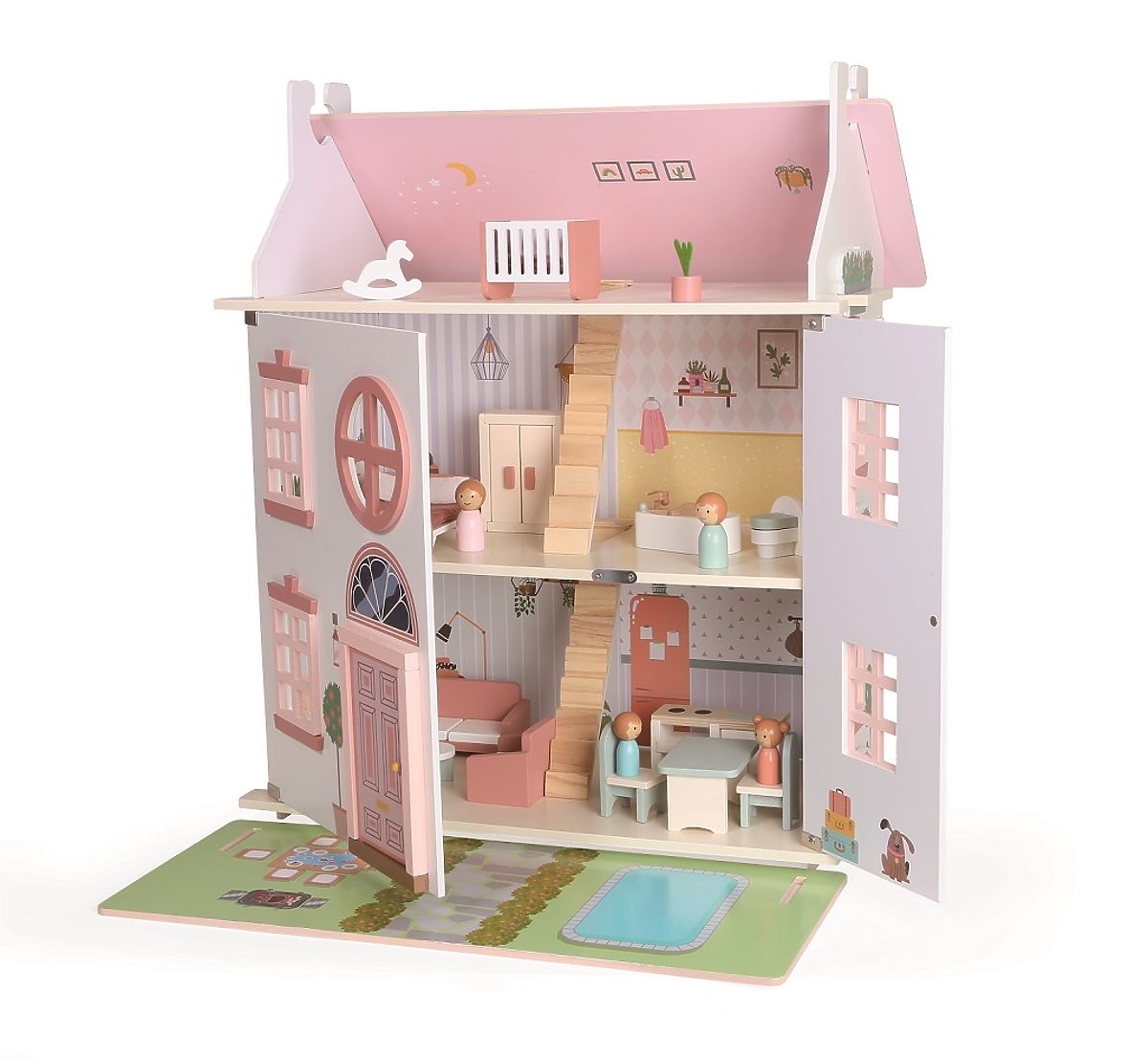 Vítejte v domečku! Na místě, kde příběhy čekají jen na Vás. Díky třem patrům a bohatě prostorným pokojům je pro Vaše malé panenky naprosto ideální. Spolu s rodinkou zde najdete vše, co je u moderní domácnosti zapotřebí – kuchyň, koupelnu, ložnici, obývák i dětský pokoj v podkroví. Sundejte přední část střechy, otočte jí a položte před otevřený domeček a hned máte pro panenky i zahradu s bazénem a nábytkem. Tvořte si rodinné příběhy dle vlastní fantazie! Při hraní děti procvičují komunikační dovednosti, prohlubují sociální interakce a využívají kreativitu Hlavní vlastnosti: oblíbený, tradiční a nadčasový domečekinspiruje k představivé hřetrénuje koordinaci a jemnou motorikuvčetně příslušenství a panenek