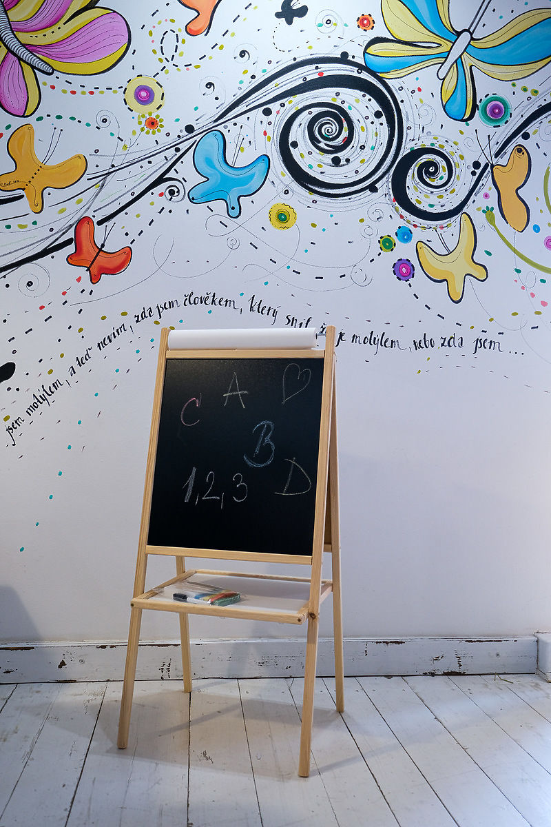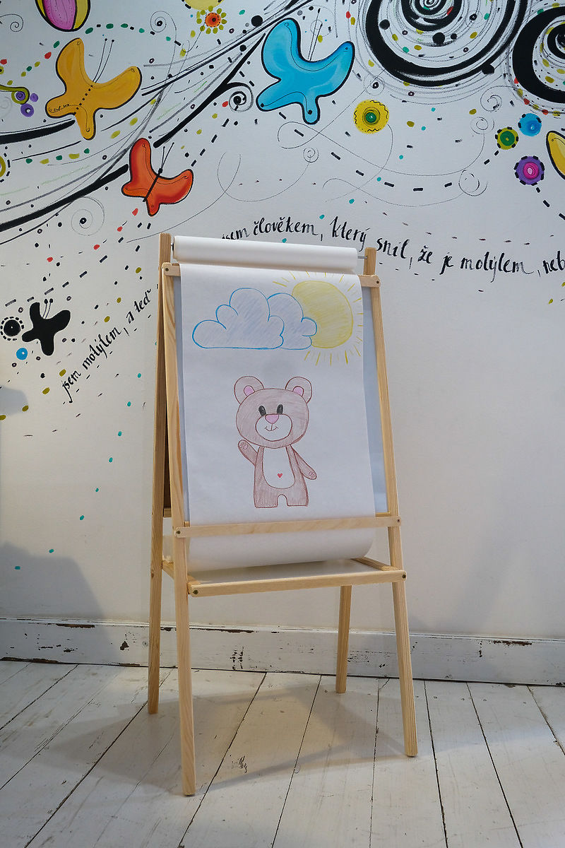 barevné křídy, houbičku, černý fix a vyměnitelnou roli papíru (20 m).