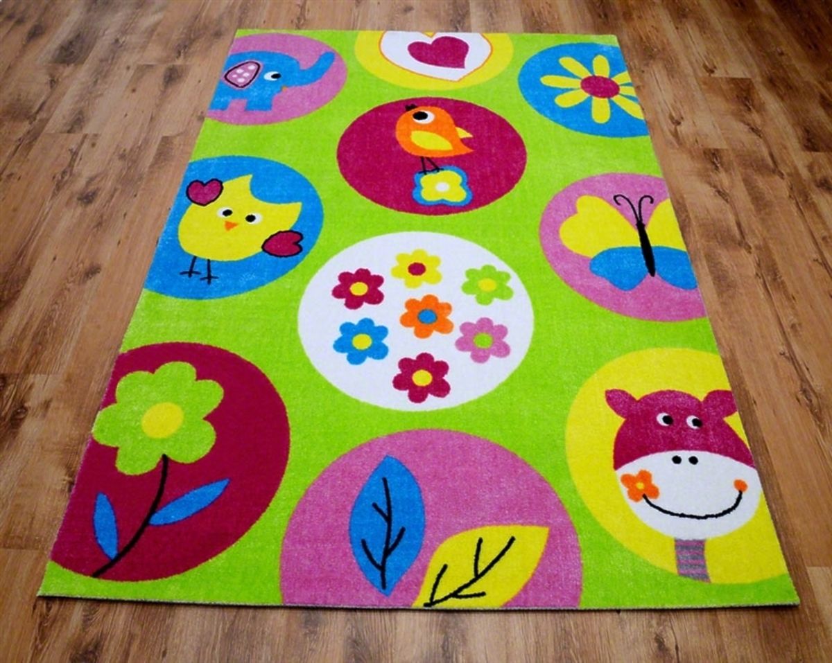 Krásný dětský koberec s motivem veselých zvířátek a květů v barevných kroužcích nadchne každé malé d .. více