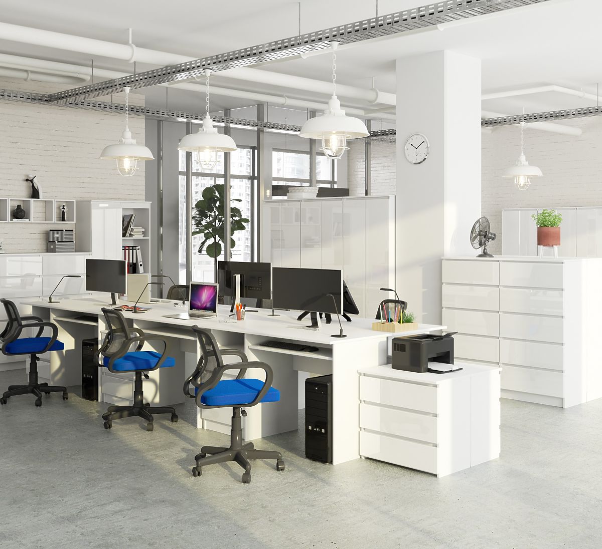 Volně stojící bílý psací stůl CLP s lesklými čely a velkou pracovní plochou. .. více