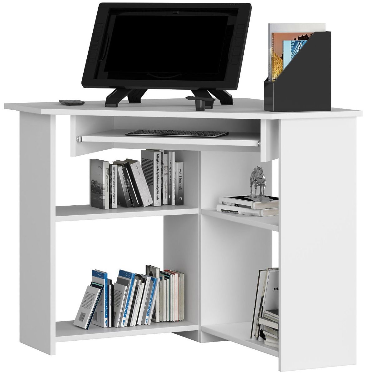 Rohový psací stůl s výsuvnou policí na klávesnici a odolnou laminovanou deskou. .. více
