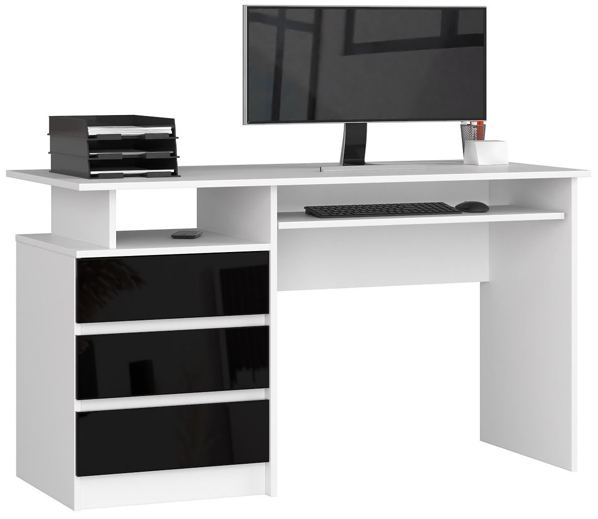 Perfektní psací stůl pro práci a zábavu by měl být pohodlný, pěkný a funkční. Takový je i stůl CLP z nabídky internetového obchodu s nábytkem Akord. Moderní vzhled mu dodává nejen efektní konstrukce, ale také poutavá kombinace černé a bílé. Díky třem prostorným zásuvkám, přihrádce na drobnosti a výsuvné zásuvce na klávesnici je tento model mimořádně praktický. Mezi jeho přednosti patří také to, že je to volně stojící nábytek - není třeba jej umisťovat ke zdi, protože jeho zadní strana je esteticky dokončena.