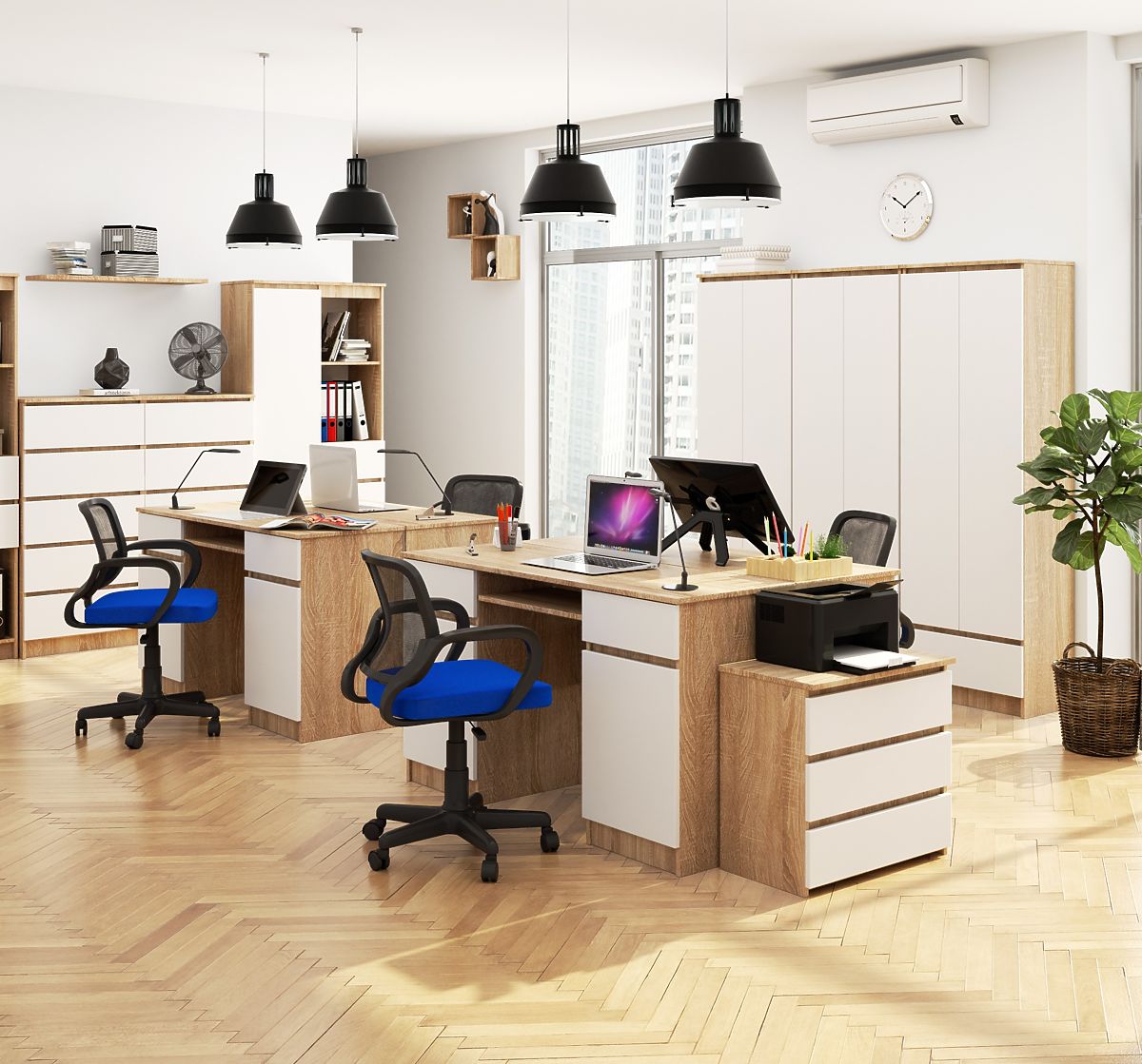 Počítačový stůl A5 o délce 135 centimetrů, který kombinuje dvě módní barvy (dub sonoma a bílá), je určen jak pro ty, kteří zařizují kancelář, tak pro domácí pracovnu, dětský nebo studentský pokoj.
