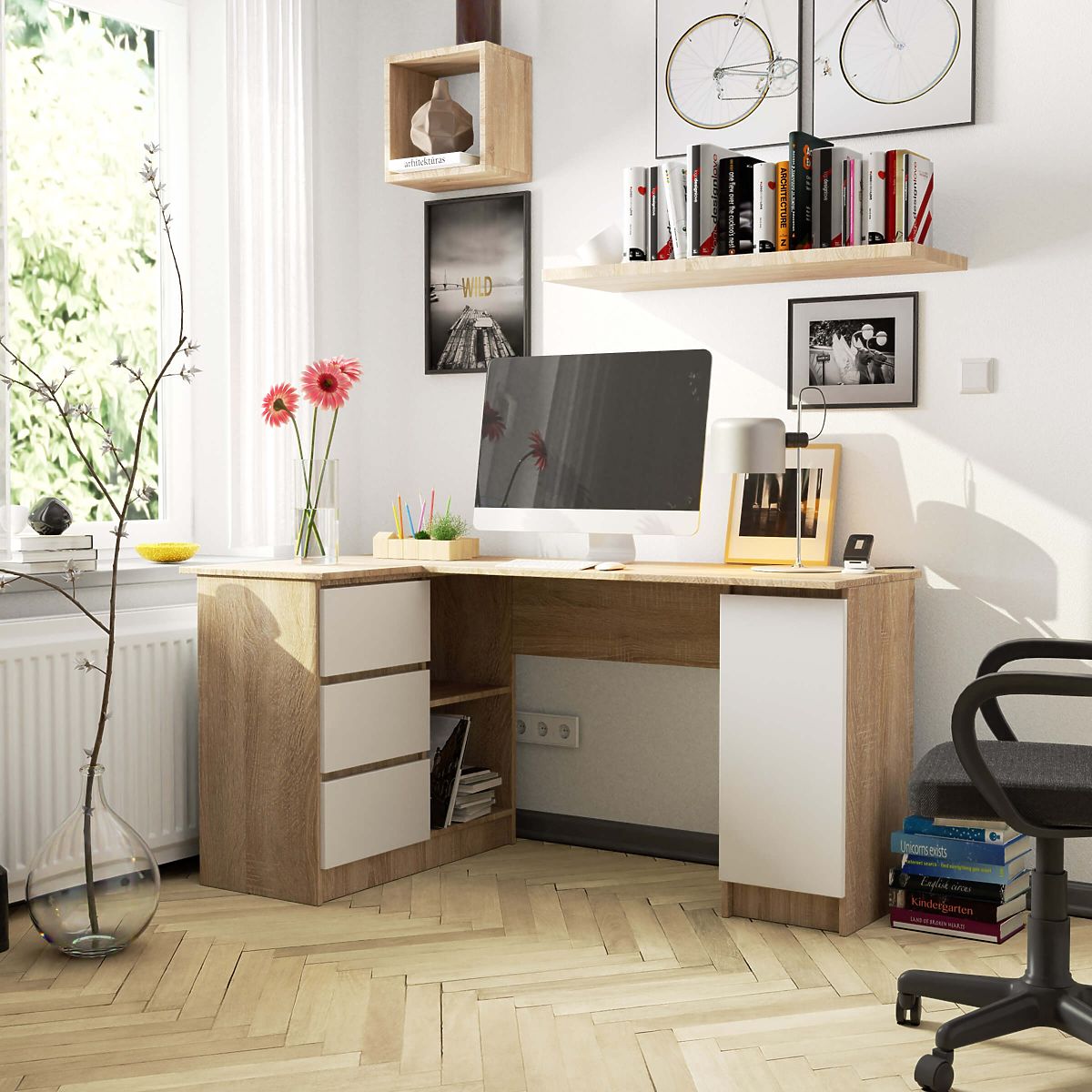 Rohový počítačový stůl se zásuvkami a skříňkou - B20 - dub sonoma s bílým čelem