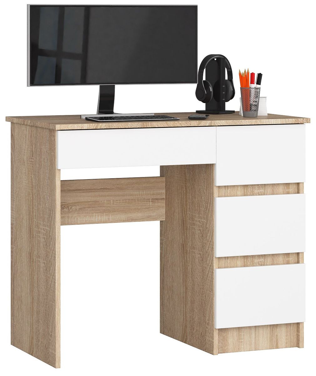 Cenově dostupný a zároveň kvalitní počítačový stůl, u kterého se můžete pohodlně učit a pracovat? Ano, to je možné s nabídkou našeho obchodu, kde najdete počítačový stůl A-7 o šířce 90 cm v pravé sonomě a bílé barvě. Je to moderní a zároveň funkční nábytek. Ideálně se hodí do obývacího pokoje, denního pokoje, mládežnického pokoje nebo kanceláře.