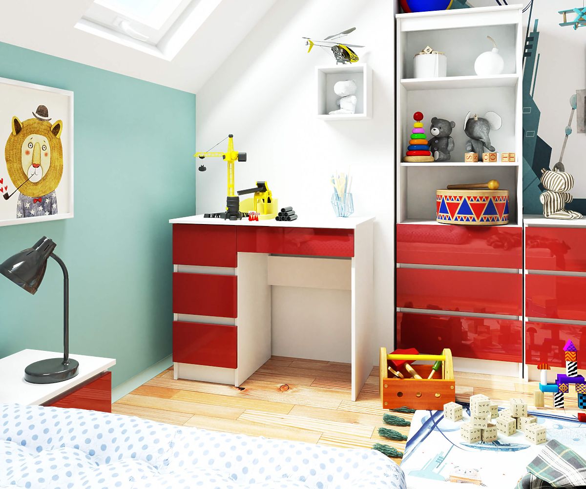 Neobvyklá barva stolu přitahuje pozornost a jeho funkčnost zajišťuje, že tento produkt splní očekávání i těch nejnáročnějších uživatelů. Nábytek kombinuje bílý korpus a efektní červené lesklé čelní plochy, které činí stůl výjimečným. Je to vhodná volba pro malé prostory díky kompaktním rozměrům konstrukce. Počítačový stůl A-7 90 cm (levý) se skládá ze čtyř zásuvek. Najde uplatnění především v dětských a mládežnických pokojích, ale také v moderně zařízených kancelářích.