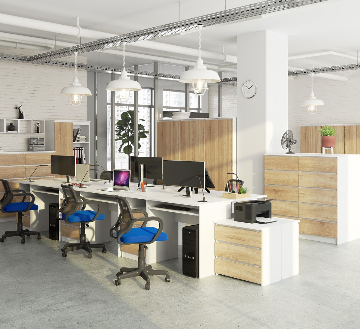 Psací stůl s bílým korpusem a čely v dekoru dub sonoma. .. více