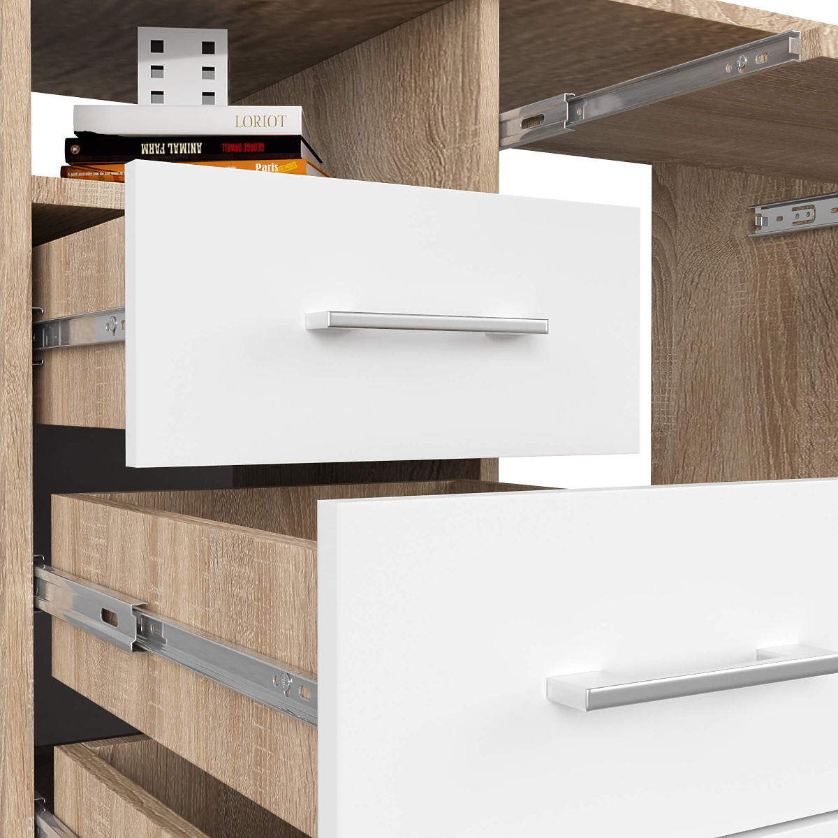 Počítačový stůl ANA je vyroben z laminované nábytkové desky odolné proti oděru ve dvou barvách. Korpus stolu tvoří deska s laminátem v barvě dubu sonoma, zatímco čela zásuvek a dvířka jsou v bílé barvě. Funkčně je nábytek rozdělen na 3 části. Krajní části tvoří skříňky, zatímco střední část je určena pro práci. Pod deskou ve střední části je výsuvná police na klávesnici, zatímco v krajních částech je umístěna po jedné otevřené polici. Pod policí na levé straně nábytku jsou navrženy 3 zásuvky umístěné jedna nad druhou, zatímco napravo je skříňka s výklopnými dvířky obsahující 2 police.