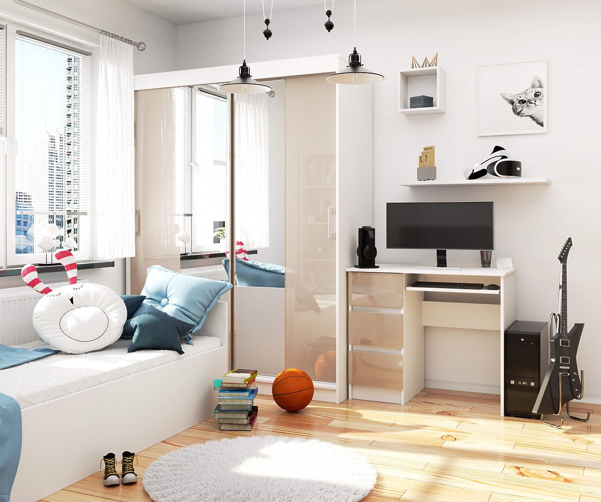 Psací stůl s lesklými cappuccino čely a bílým korpusem. .. více