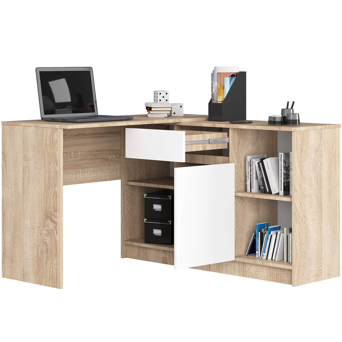 Sestava B-17 komoda a psací stůl je mimořádně funkční. Jeho konstrukce umožňuje montáž jak pravostrannou, tak levostrannou. Díky tomu jej lze přizpůsobit prostoru, který máte k dispozici. Sestava bude vhodná do kanceláře, včetně domácí, nebo do studentského pokoje. Spojení stolu a komody v celek umožňuje plněji využít prostor. Police pojmou šanony, kancelářské a psací potřeby nebo knihy. Je zde také zásuvka na drobné pomůcky. Díky tomu bude vše potřebné během práce nebo studia na dosah ruky.