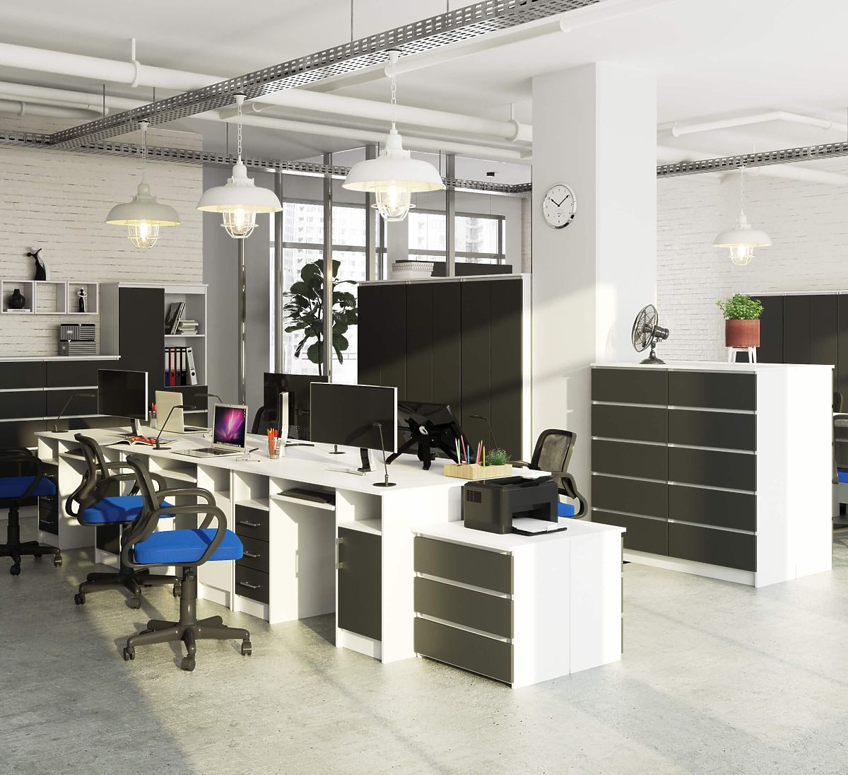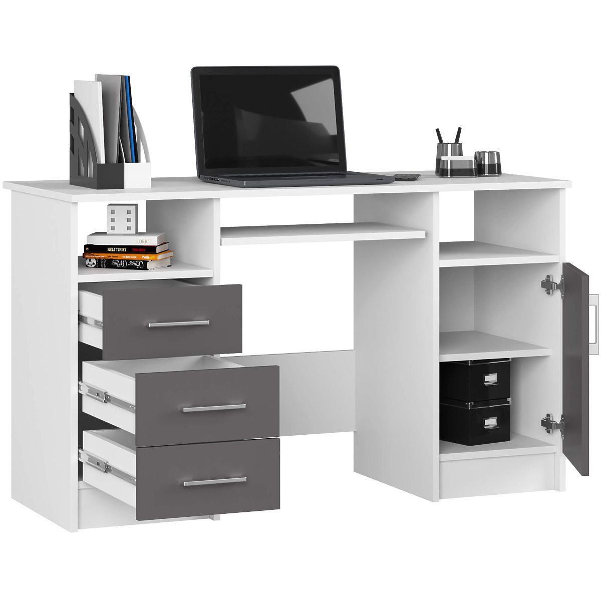Počítačový stůl ANA 124 cm díky klasické kombinaci bílé a grafitově šedé barvy snadno zapadne do každého interiéru. Byl navržen s ohledem na kancelářské prostory a pracovny. Hodí se také do pokoje teenagera. Na desce stolu je spousta místa – můžete na ni umístit monitor a další nezbytné pracovní předměty podle potřeby. Pro klávesnici je zde samostatná výsuvná police. Stůl nabízí velké množství prostoru pro libovolné uspořádání: dvě výklenky, tři zásuvky a skříňku s policí. Celá konstrukce je vyrobena z laminované desky, která je snadno udržovatelná a odolná proti oděru. Stůl ANA je elegance, funkčnost a solidnost v jednom.