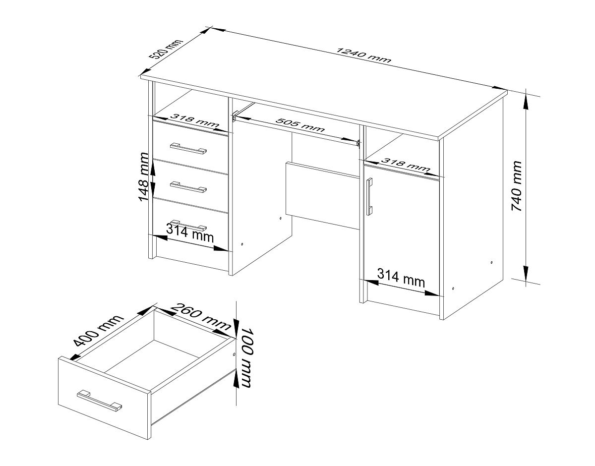 Vyrobeno z laminované desky odolné proti oděru. Deska, boky a čela jsou olepena ABS hranou. Má výsuvnou polici na klávesnici, 3 zásuvky a dvířka s čely z laminované desky.