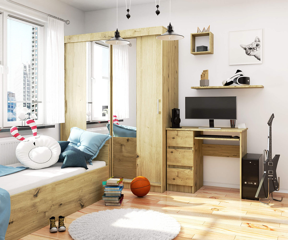Počítačový stůl A-6 dub artisan se skvěle hodí do dětského a mládežnického pokoje, ale také do pracovny. Jeho malé rozměry umožňují také uspořádání prostoru pro studium nebo práci z domova v ložnici nebo obývacím pokoji. Stůl je také ideální pro malé, útulné kanceláře. Díky barvě dub artisan se nábytek hodí jak k moderním, tak i ke klasickým nábytkovým prvkům.