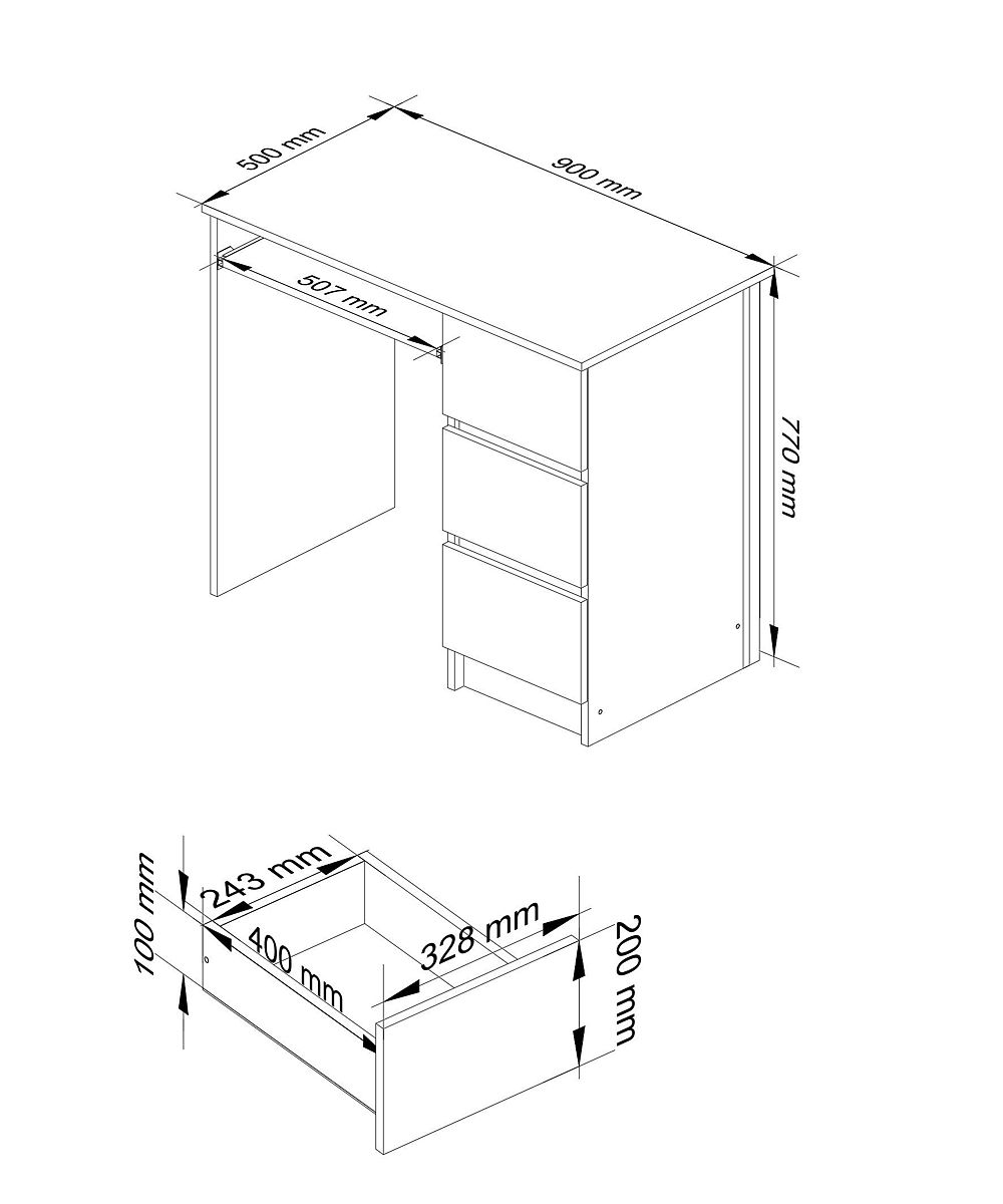 Psací stůl vyrobený z laminované desky je produkt, který se vyznačuje vysokou odolností proti oděru, díky čemuž zůstane v dokonalém stavu po dlouhou dobu. Jeho univerzální vzhled zajišťuje, že se bude skvěle hodit do každé místnosti. Nábytek je vybaven deskou, výsuvnou policí a třemi prostornými zásuvkami, které lze uspořádat podle individuálních potřeb.