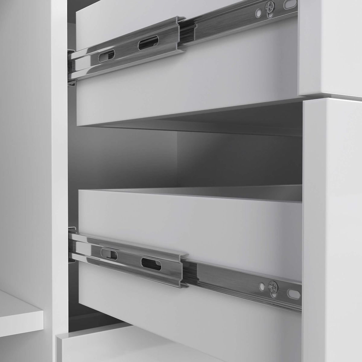 - Zásuvky se pohybují na kovových kuličkových pojezdech