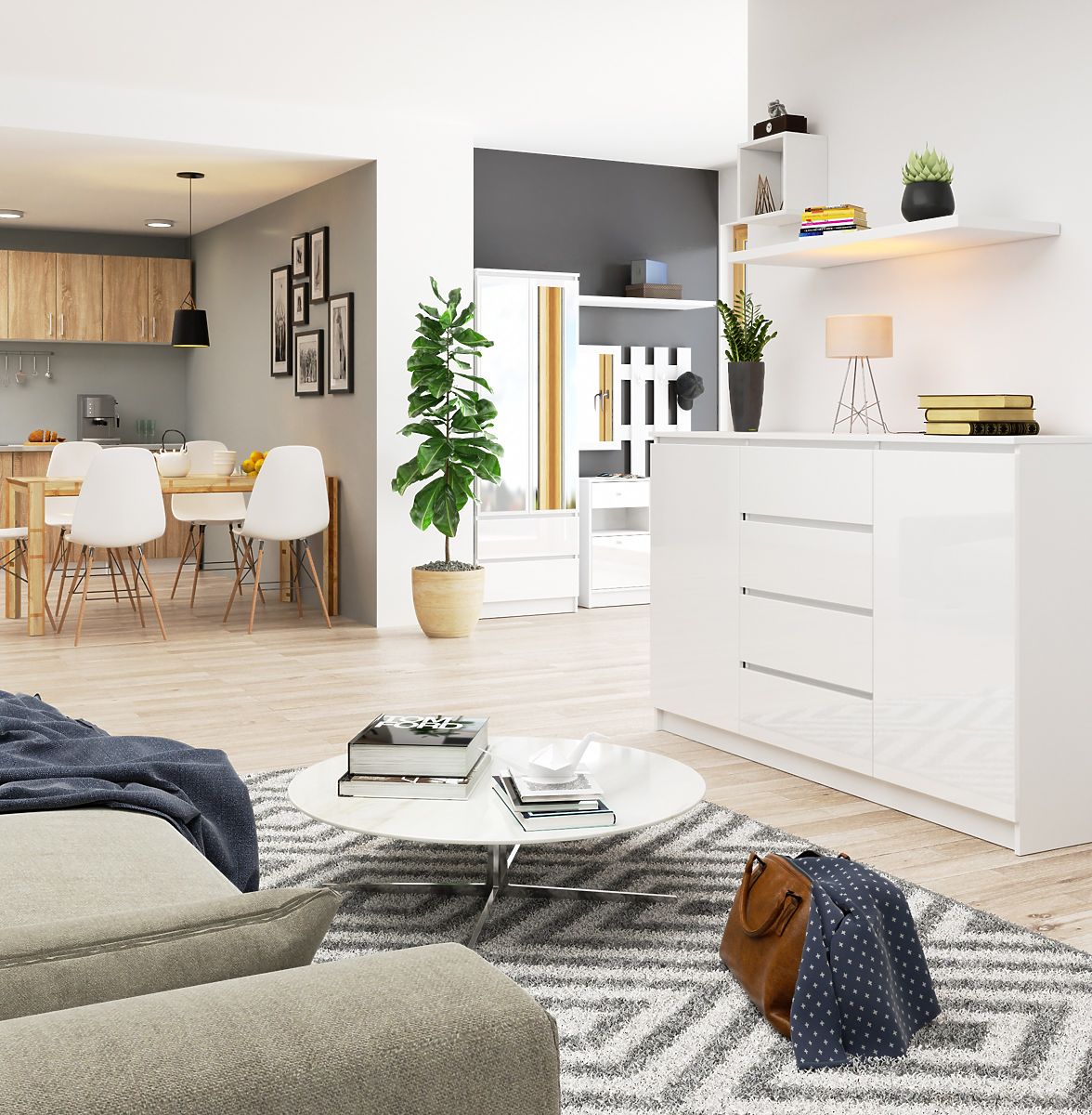 Hloubka - 40cm- Korpus komody je vyroben z laminované desky bílý polomat 16mm odolné proti oděru