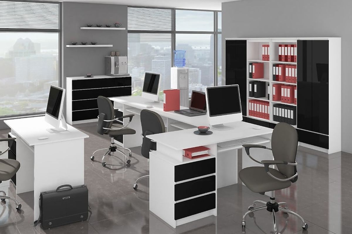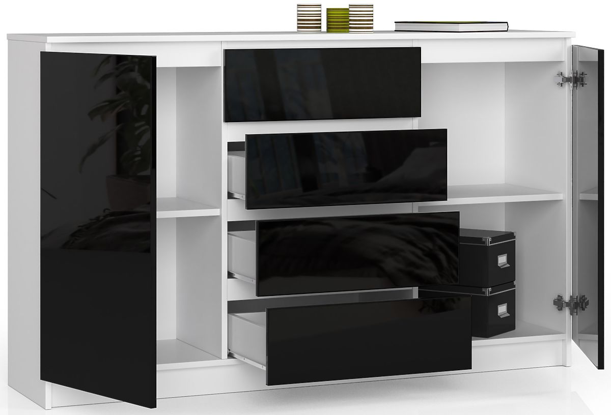 Korpus komody je vyroben z laminované desky 16 mm v bílé polomatné barvě, čela jsou z akrylové desky dekor Černý 19 mm vysoký lesk.