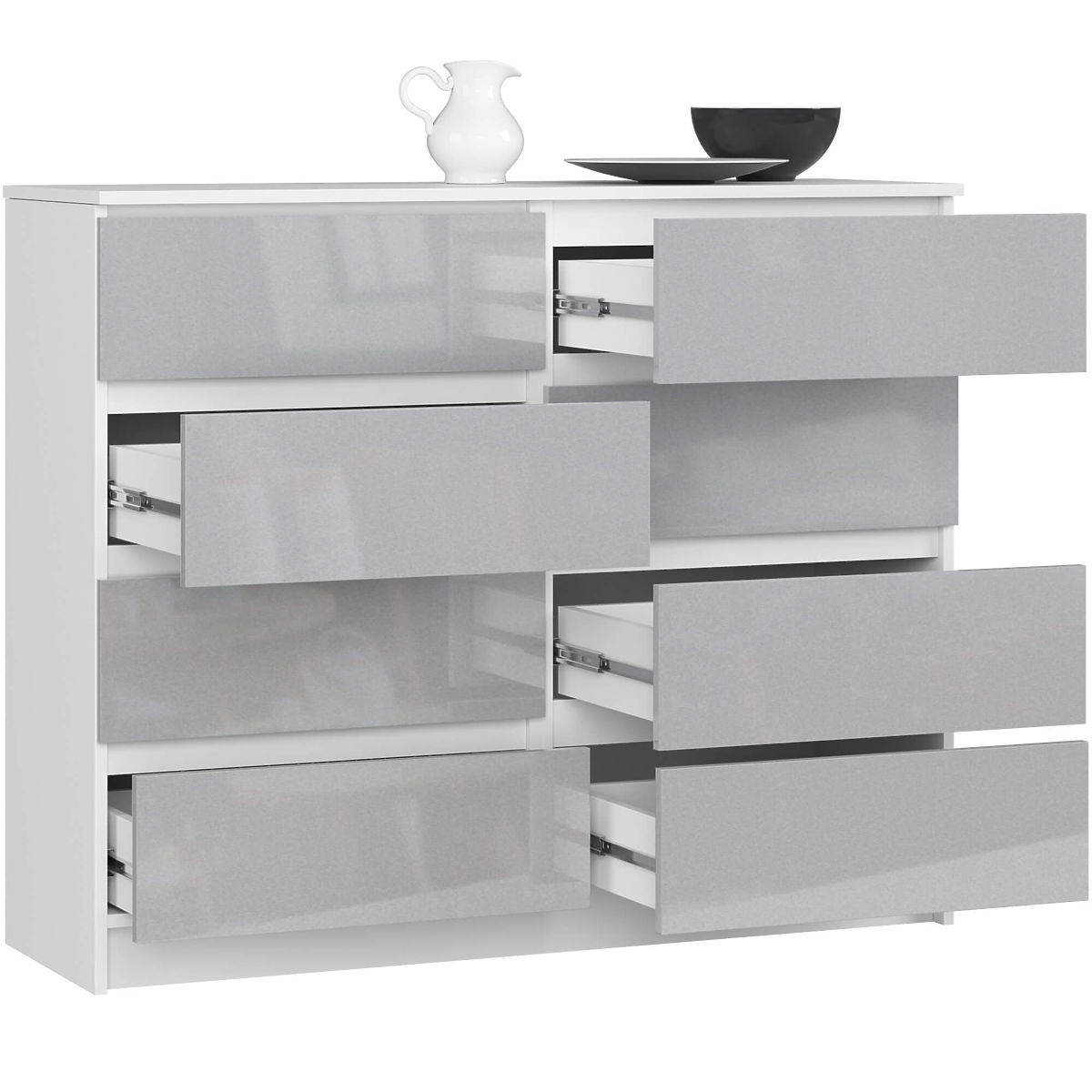 Nabízíme velkou komodu s 8 zásuvkami. Komoda má bílý polomatný korpus vyrobený z laminované desky o tloušťce 16 mm, která je velmi odolná proti oděru. Čela jsou vyrobena z MDF desky s akrylovým povlakem o tloušťce 19 mm, který se vyznačuje vysokou trvanlivostí a je odolný proti vyblednutí vlivem intenzivního slunečního světla. Hrany jsou opatřeny ABS hranou, která zajišťuje vysokou ochranu proti mechanickému poškození a oděru. Zásuvky bez úchytek mají moderní barvu metalik s vysokým leskem. Zásuvky jsou vedeny na kovových kuličkových pojezdech. Komoda má jednoduchý a zároveň velmi univerzální vzhled. Dokonale se hodí do každého interiéru, bude vypadat stejně dobře v obývacím pokoji, ložnici nebo dokonce v kanceláři. Díky velmi prostorným a objemným zásuvkám bude v každé místnosti pořádek. K tomuto modelu komody lze úspěšně sladit další nábytek ze série CLP.